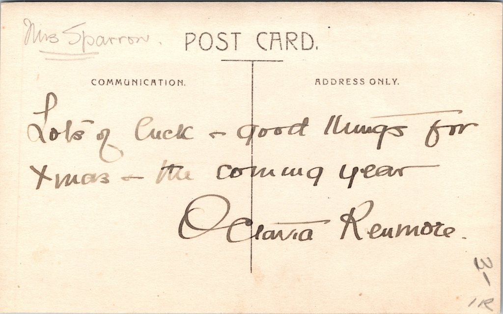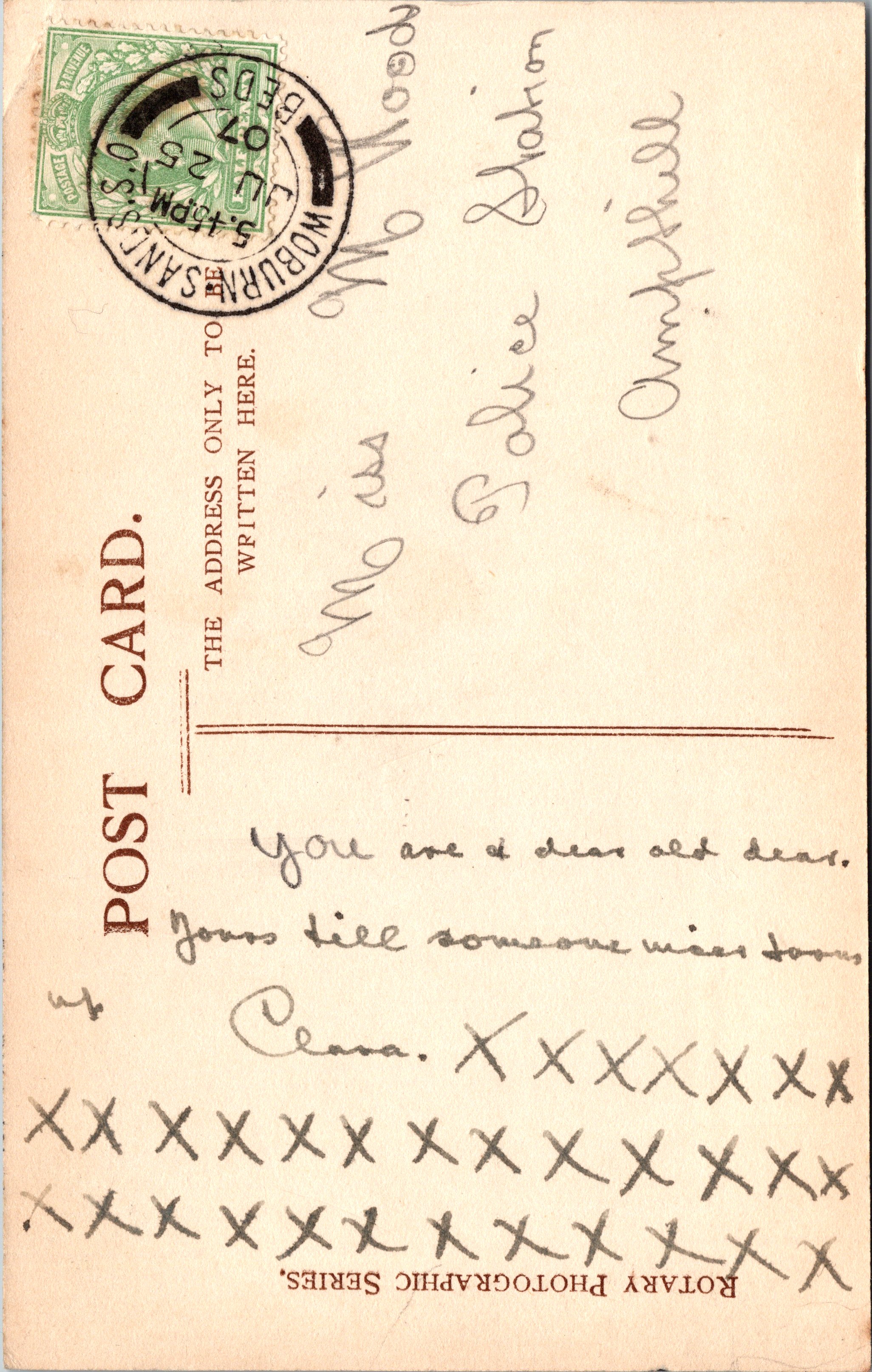 Postcard 2 features a photograph taken by female celebrity photographer, Lizzie Caswall Smith. Lizzie Caswall Smith (1870-1958) was a British photographer who operated in the early 1900’s. She specialized in photographing members of society and celebrities. Many of her photographs were used for postcards. She was involved in the Women’s Suffrage movement and photographed many of the leading suffragettes. She also photographed many actors including Billie Burke and Maude Fealy. She operated the Gainsborough Studio from 1907 through 1920 (309 Oxford Street) and moved to a new location (90 Great Russell Street) where she remained until she retired in 1930 at the age of 60 years-old. Her most famous photograph is a portrait of Florence Nightingale taken in 1910. It was auctioned in 1908 and sold for 5500 pounds which is an equivalent today of nearly 8,000 dollars. The National Portrait Gallery has 84 portraits associated with Lizzie Caswall Smith. This postcard was published by the Rotograph Company which was based in New York City. The postcard is part of a series (No.B636). SOLD
