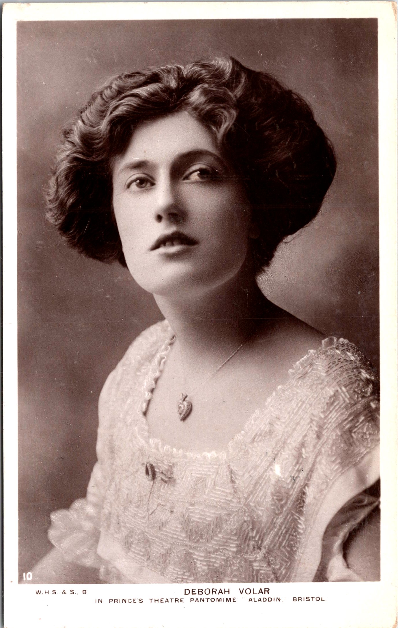 Postcard 2 shows Volar in costume for her role in “Aladdin” at the Prince’s Theatre in Bristol, England. Twelve photographs of Deborah Volar can be found in Great Britain’s National Portrait Gallery. This postcard is dated 1909. This vintage postcard was published by W.H.S. & S. B. (W. H. Smith & Son) as part of the Grosvenor series (No.10). The firm was located in Bristol. The card was printed in England. SOLD