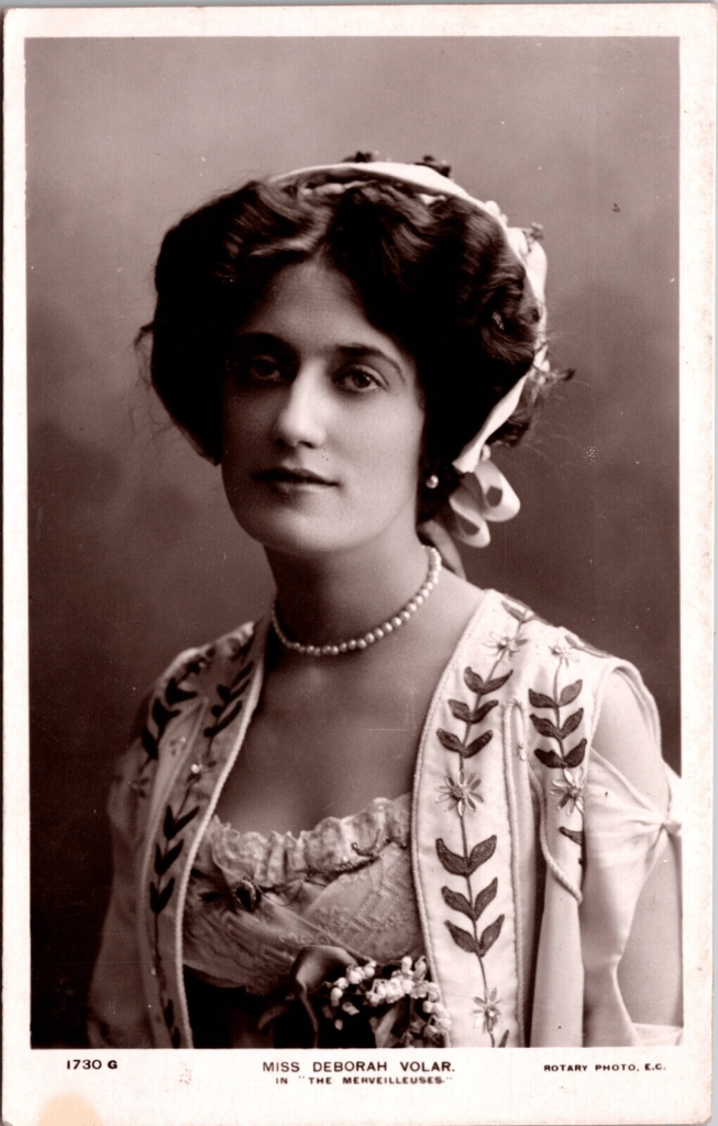 Postcard 1 shows Volar in costume for her role in “The Merveilleuses”. The title can be translated as “The Marvellous Women”. Historically, these women lived at the end of the 18th century and were known for their outrageous style of fashion and behavior. Their fashion style was neo-classical and naked legs and toes challenged the mores of the day. These women were expressing their freedom through fashion. “The Merveilleuses” was a musical play that can be categorized as a love story. Twelve photographs of Deborah Volar can be found in Great Britain’s National Portrait Gallery. This vintage postcard was published by Rotary Photo as part of a series (No.1730G). The card was printed in England and is in fair condition (see scans).
