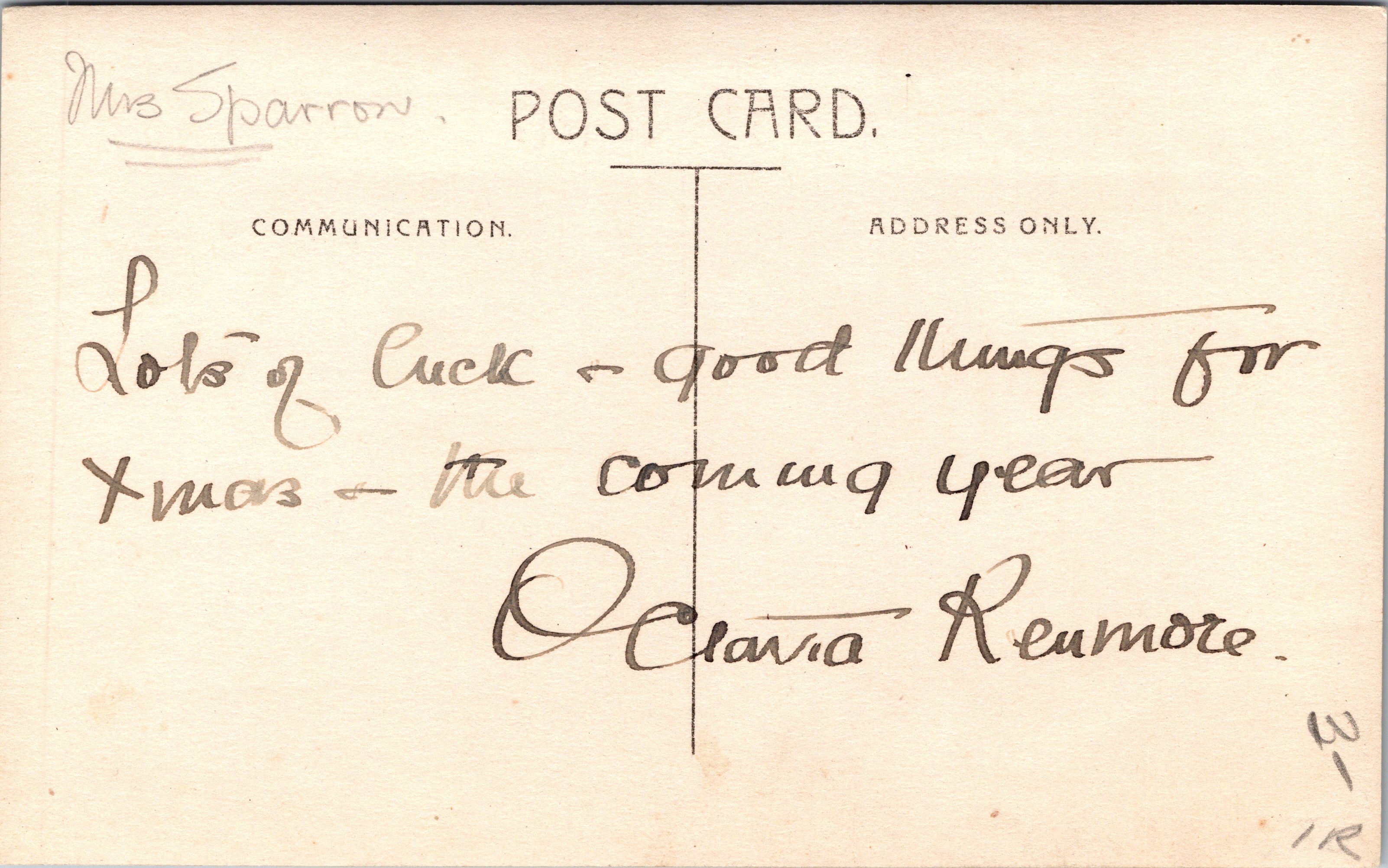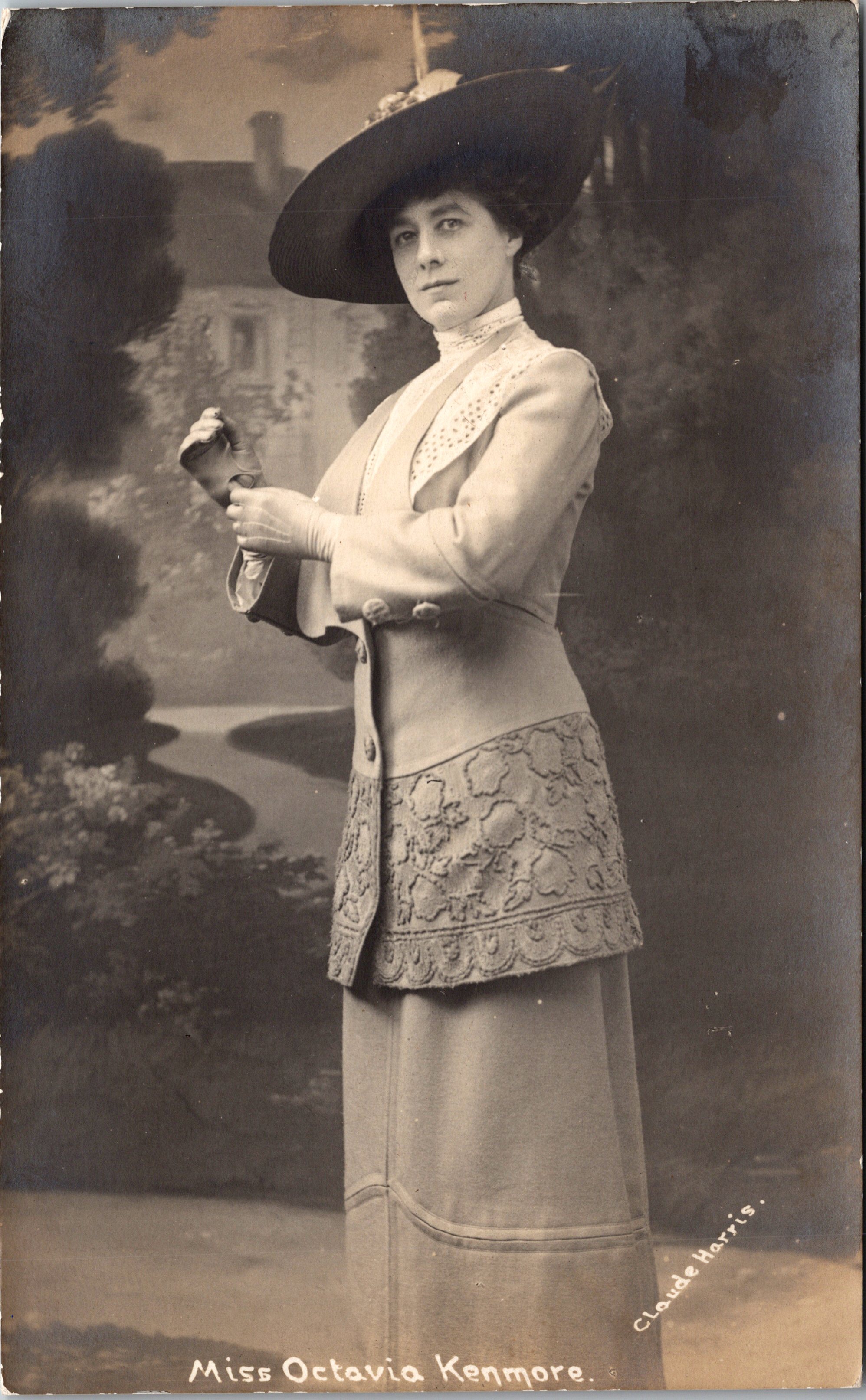 This vintage real photo postcard features British actress, Miss Octavia Kenmore. Kenmore was an actress who performed in many productions of Shakespeare’s and Ibsen’s plays. She also was a Broadway actress. She was in eight Broadway shows from 1921 through 1947. Her appearances included a role in Hedda Gabler. Kenmore received many fine reviews in her long theatrical career. In a review of her London debut performance, one critic was not totally impressed. He states that she had a pleasing voice, intelligent and pretty features, and a good presence. He continues with the comment that she should have had more experience before taking on the difficult role in W. S. Gilbert’s fairy comedy, “The Palace of Truth” (1888). The critic’s final assessment of Miss Kenmore was biting. He declared that “Her performance was emphatically one of promise, not of fulfillment.” This vintage portrait postcard is unique in that the reverse of the postcard has a message from Kenmore. She has also signed the postcard. Her signature has not been authenticated. The photograph of Miss Kenmore seen on this card, was taken by Claude Harris (1883-1961). He has 61 photographs in the collection of the National Portrait Gallery. His studio was located in London. He fought in the Boer War and World War I. He produced and directed a film “The Sanctuary” (1916). He photographed many celebrated theater celebrities. Harris was considered a master of lighting.