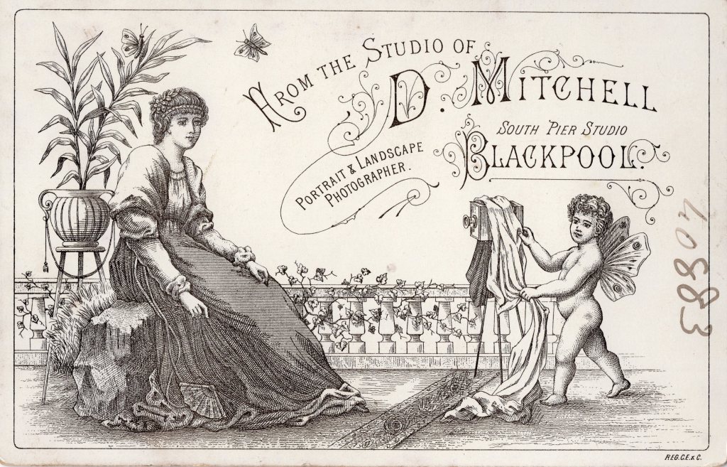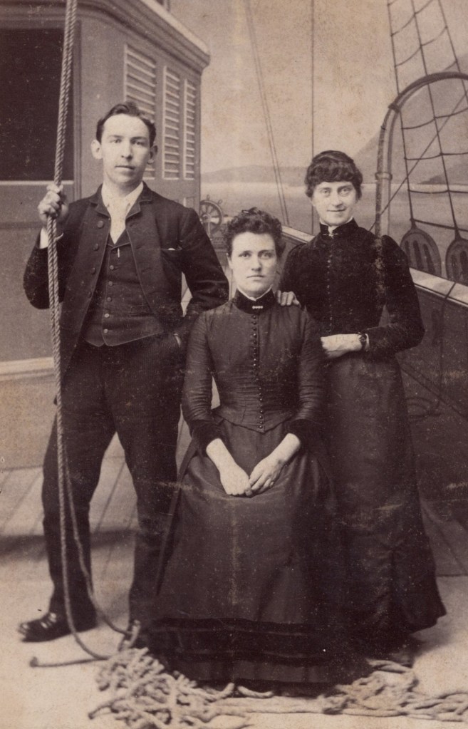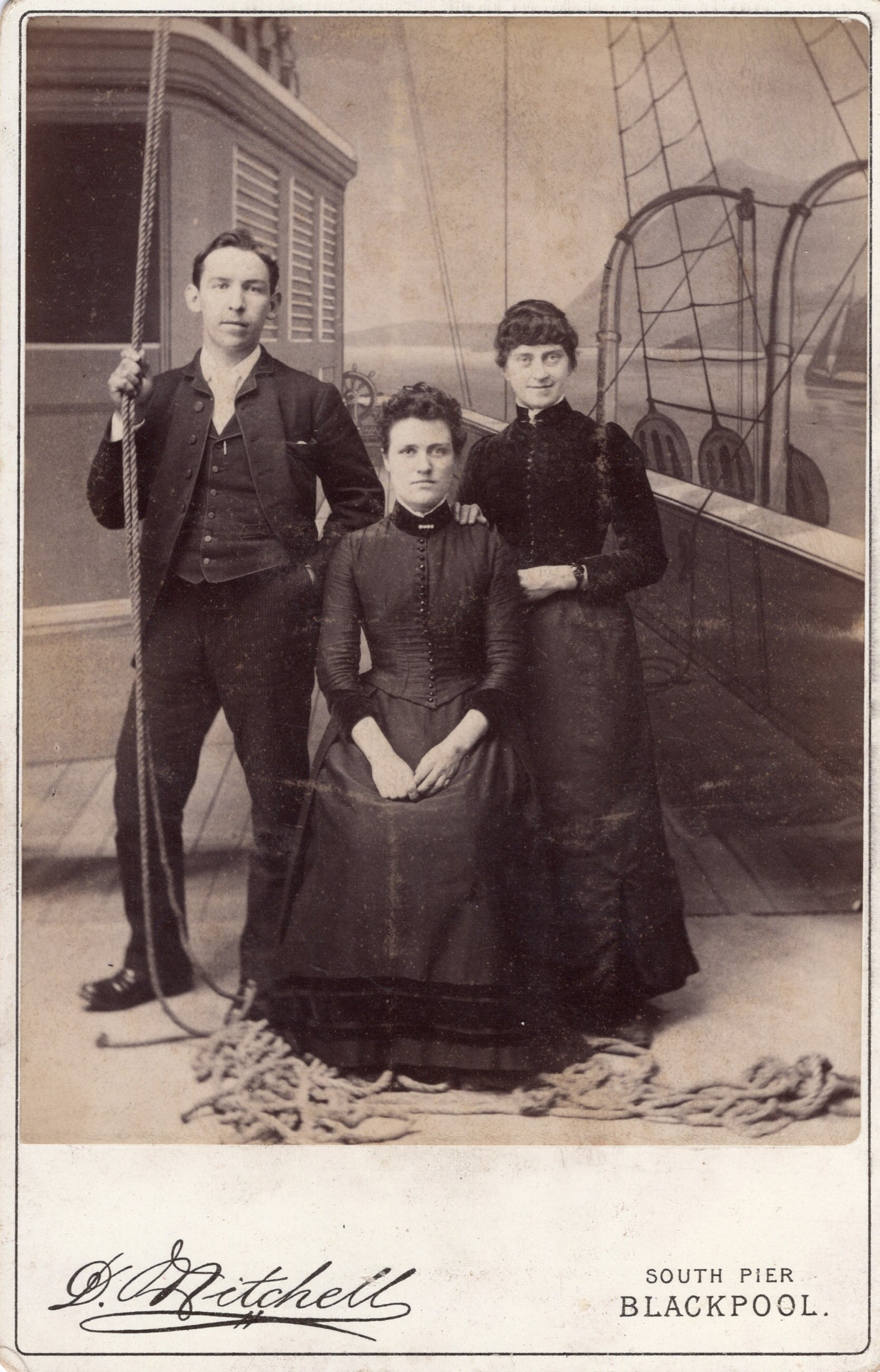 This cabinet card of a man and two women posing aboard a ship, was photographed by D. Mitchell of Blackpool, Great Britain. The photographer, whose studio was located near a pier in the seaside city of Blackpool, utilized a relevant nautical theme. The backdrop is fantastic and the hanging rope held by the gentleman, and the ropes in front of the ladies, are a “great touch”. This is one of the finest uses of background scenery and props that can be found in the entire cabinet card gallery. The South Pier was originally named the Victoria Pier. The pier opened in 1893 and served vacation travelers to Blackpool. The subjects of this cabinet card image are likely tourists on holiday.