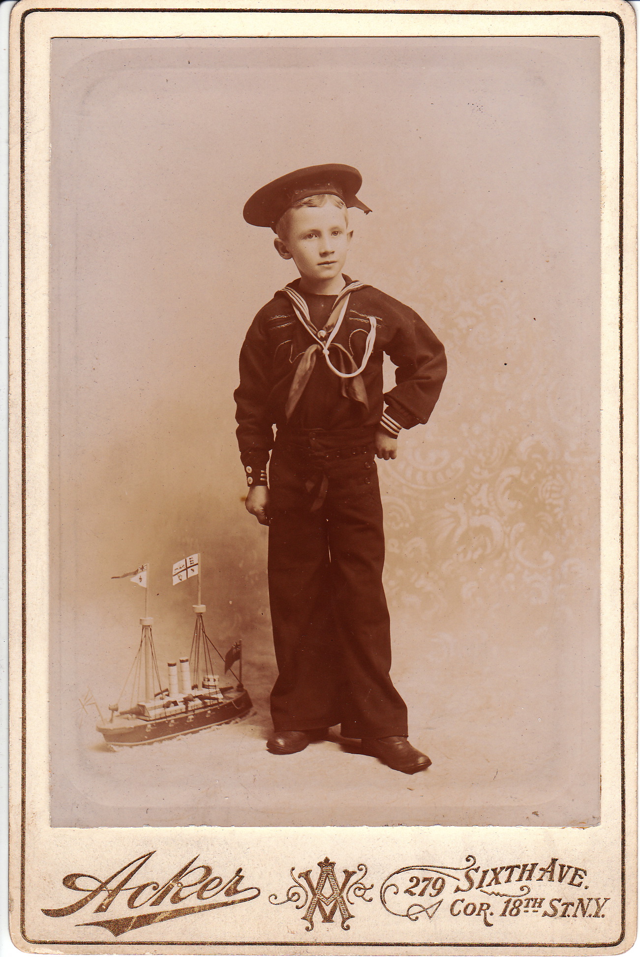 A young boy poses proudly wearing a very realistic looking naval uniform. He is standing next to his very detailed toy boat. The ship appears to be a war vessel and appears to be flying a flag similar to the flag of Great Britain. The little admiral was photographed by a New York City photographer named Acker. Perhaps a visitor to the cabinet card gallery can identify the navy represented by the lads uniform and the vessel’s flag. (SOLD)