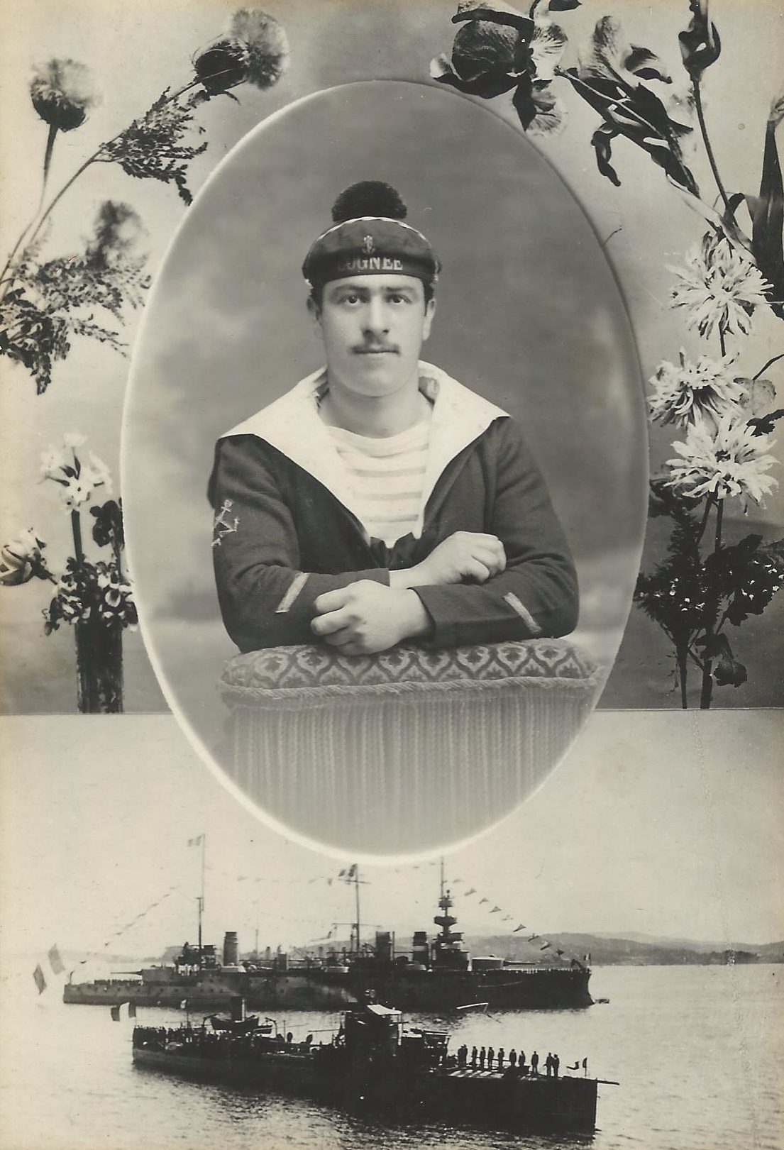 PORTRAIT OF A FRENCH SAILOR AND HIS BATTLESHIP (THE DESTROYER COGNEE) c1909