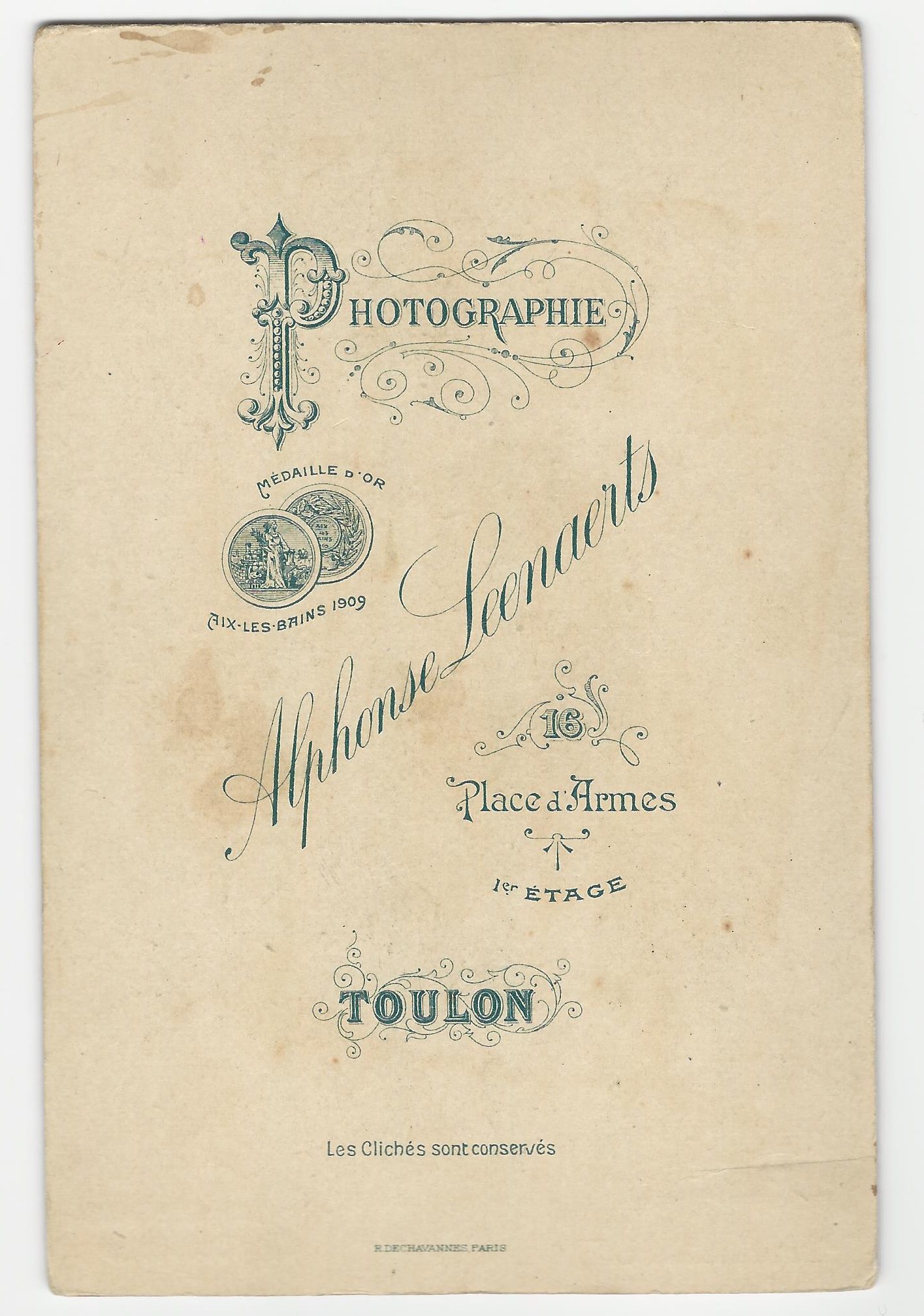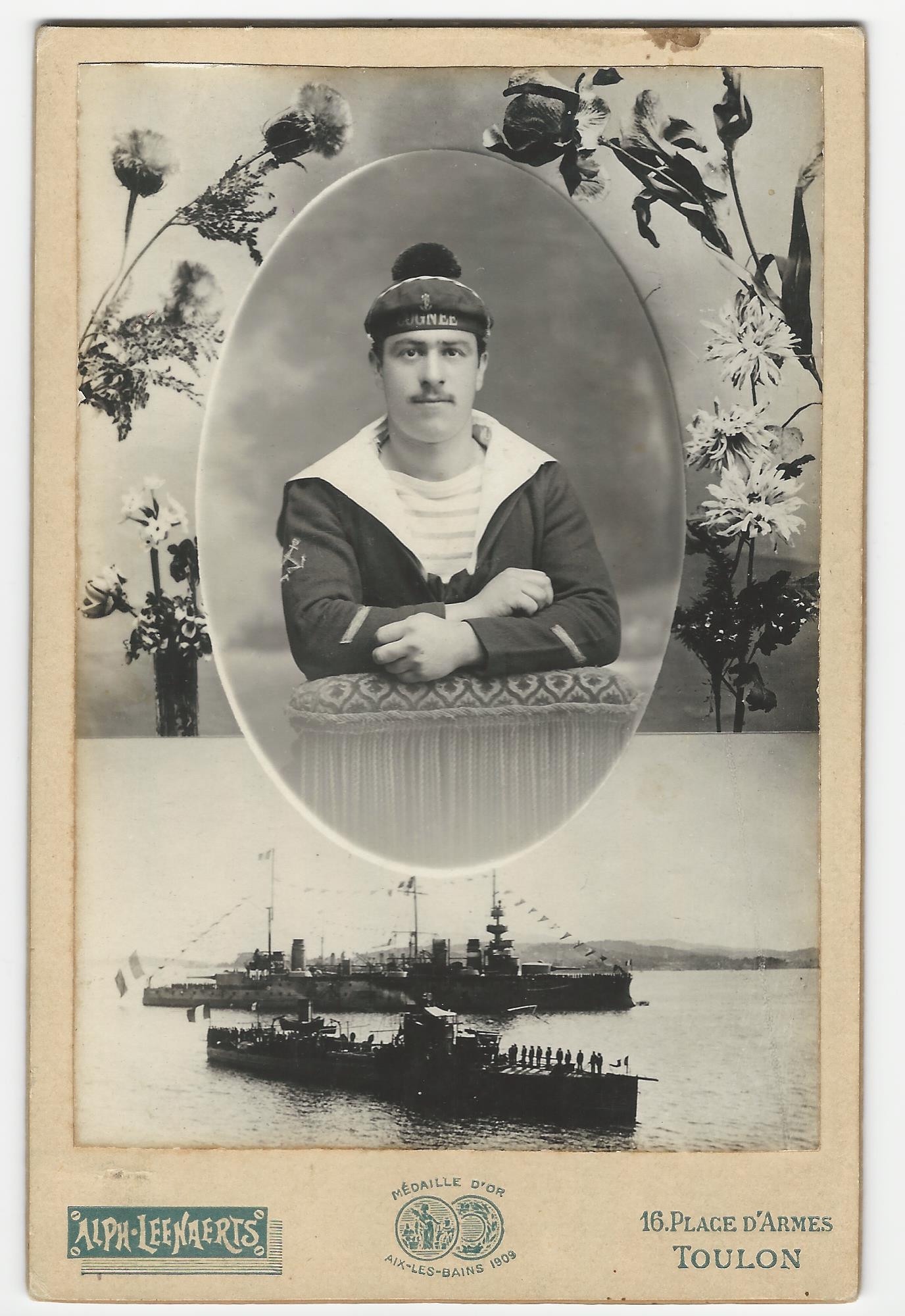 This fantastic cabinet card photograph is truly unusual. An oval photo of a handsome young uniformed sailor is in the center of the image. Below his portrait is a photograph of two navy battleships. The name of the sailors ship is embroidered into his cap. The sailor was on the French navy torpedo destroyer, the Cognee. The ship was one of 13 Claymore-class destroyers built around 1905. The photographer of this image is Alphonse Leenaerts and his studio was located in Toulon, France. Toulon is a port city on southern France’s Mediterranean coast. The city serves as a major naval base. Alphonse’s brother Henri, was also a photographer. The pair, who were Belgian, operated in Toulon between 1871 and 1914. They worked independently. Alphonse moved to the address listed on this photograph in about 1903. The reverse of this photo has advertising indicating that Alphonse won a medal for his work in 1909. This photo was taken shortly after that date. This cabinet card photograph is in very good condition (see scans).