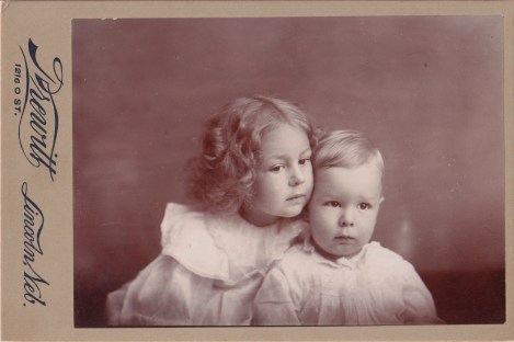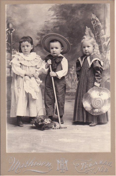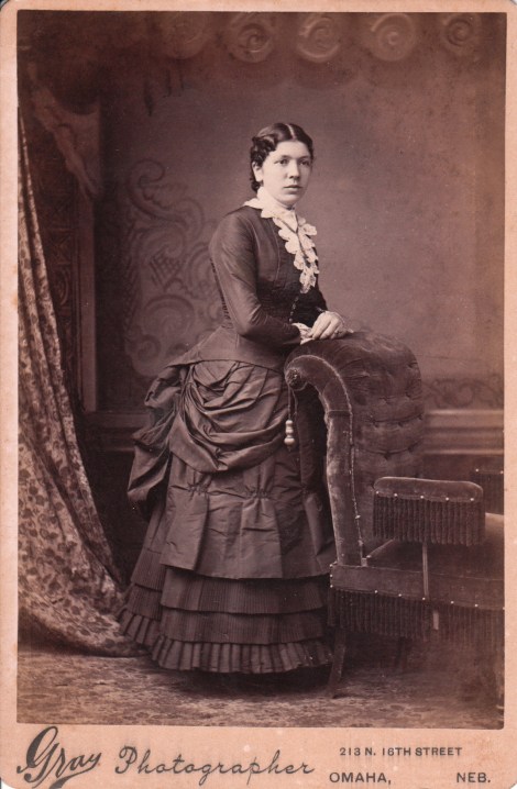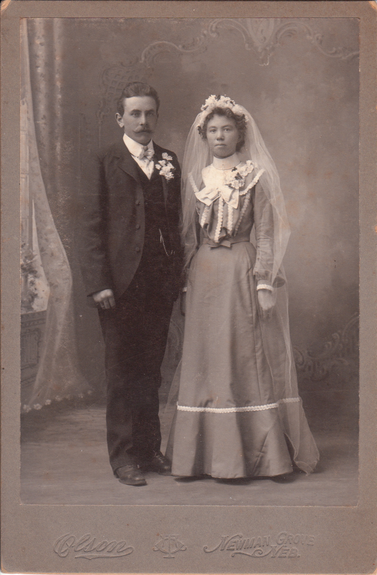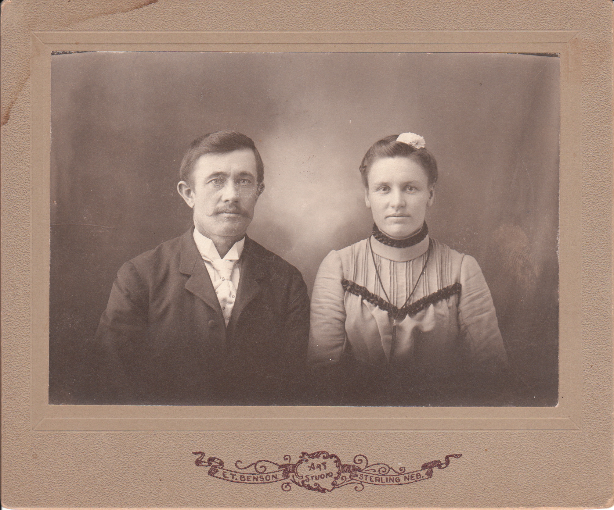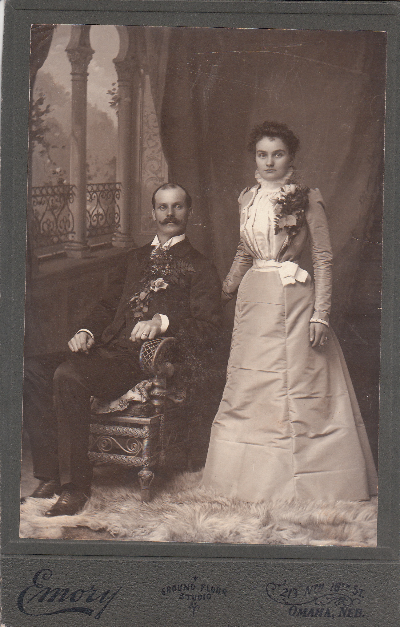 An “ordinary” couple poses for their portrait at the Sterling, Nebraska photographic studio of E. T. Benson (1870-1935). The couple are identified on the reverse of the photograph as Albert and Bertha (Wuske) Maulis. Research uncovered a copy of this image and it was referred to as a wedding picture. Albert Moulis (1868-1960) is listed in the 1900 through 1930 US census. The 1900 US census reveals that he was born in Bohemia and immigrated to the US (1888). His occupation was listed as farmer. He is also listed as a farmer on the 1910 census but by 1920 he had become a machinist. A popular genealogy site has an entry that states that Albert’s journey to America started when he stowed away on a ship rather than enter military service in the army of the Austrian Empire. Albert’s wife, Bertha (1878-1937). , was Nebraska born, but came from parents with Prussian and German heritage. This vintage photograph is in good condition (see scans). (SOLD)