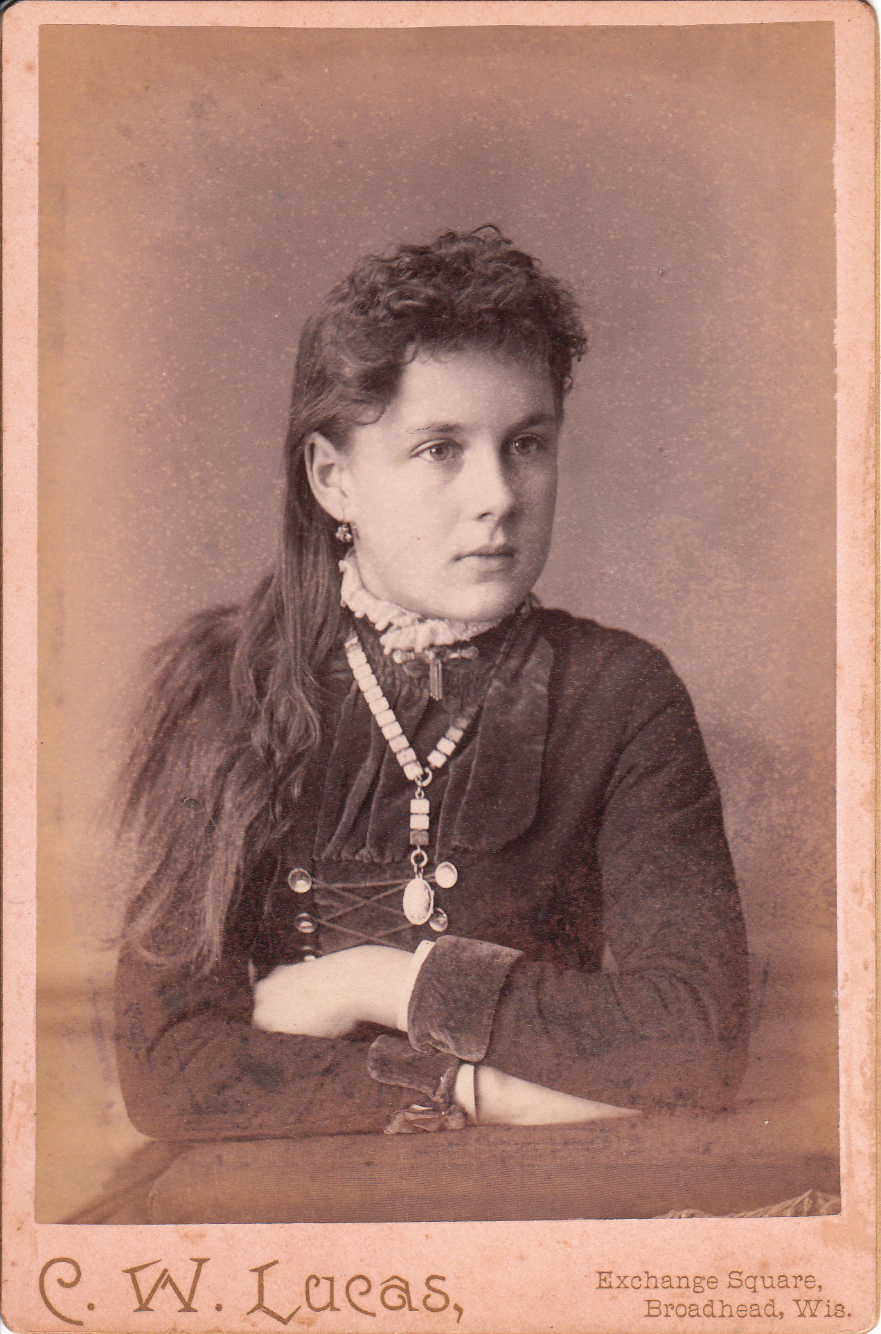 A young woman poses for her portrait at the studio of C. W. Lucas in Brodhead, Wisconsin. She has long dark hair and is dressed nicely but not fancy. She is wearing an interesting necklace. The necklace is a string of small cubes. Hanging from the necklace is a small cameo. Photographer, Charles W. Lucas located to Brodhead in 1869, He was born in 1841 and was a native of Maine. He entered the field of photography in 1866 and moved to Wisconsin in 1868. He partnered with others in photography studios until 1871 when he began to operate independently. He was married to Bashie Springstead of Brodhead. It is interesting to note that there is an error on the front of this cabinet card. The name of the town of “Broadhead” is misspelled. The name should be spelled “Brodhead”. One wonders why Charles Lucas kept the card stock even though part of his address was spelled incorrectly.