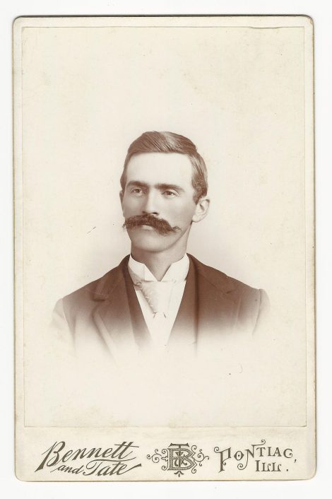 An unidentified well dressed gentleman with a thick mustache, poses for his portrait at the Bennett and Tate studio in Pontiac, Illinois. No biographical information about Mr Bennett was found in a preliminary search. However, investigation did find some information concerning Mr Tate. Samuel W. Tate (1886-?) is listed as living in Pontiac during the 1900 US census. Nettie Tate (1870-?), is listed as a photographer in the same census. She was Samuel’s sister. Samuel Tate was a photographer in Ponitac from the 1890’s until 1905. This cabinet card has a slight bow and is in good condition (see scans). (SOLD)