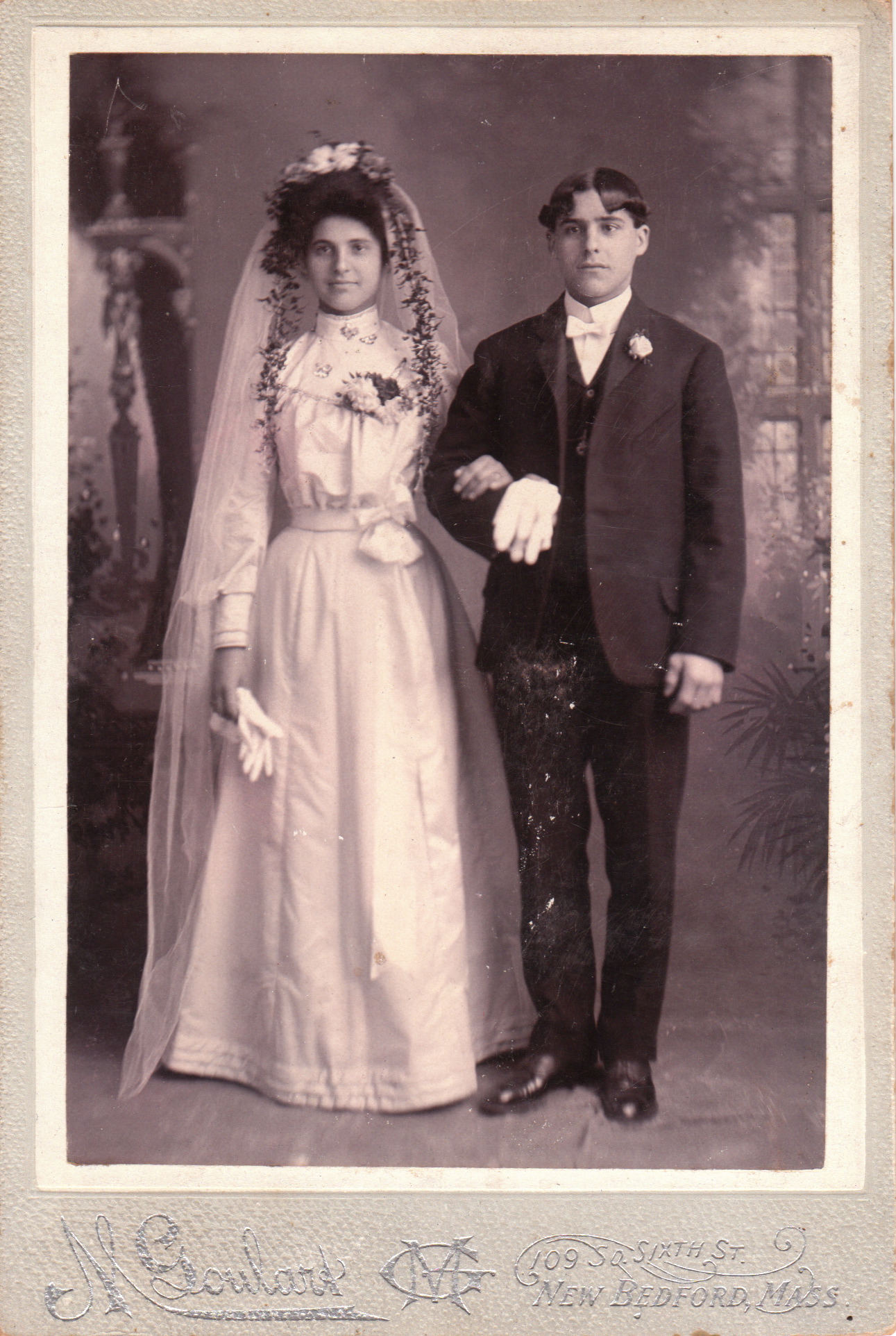 This photograph has significant damage but it finds it’s way to the cabinet card gallery because it features an attractive and very young looking bride and groom as well as an interesting photographer. Both of the subjects are holding formal gloves. The photographer of this image is M Goulart of New Bedford, Massachusetts. Manuel Goulart is a noted historical figure in American photography. In fact, he and his brother Jose Goulart were the subject of a book, “Two Brothers Goulart: Photography in New Bedford and the Azores” (1996). The Azorean brothers became interested in photography in the 1870’s. They were from the Portuguese island of Faial in the Azores and came to New Bedford in 1889. Between 1892 and at least 1899, Manuel Goulart’s studio was located at 109 South Sixth Street in New Bedford. New Bedford had a significant population of people of Portuguese ethnicity. It is likely that the bride and groom in this portrait were part of that Portuguese community. The brothers are noted for their late 19th century and early 20th century photographs from the Azores, Madeira, and Portugal. The New Bedford Whaling Museum has a large collection of Goulard photographs.