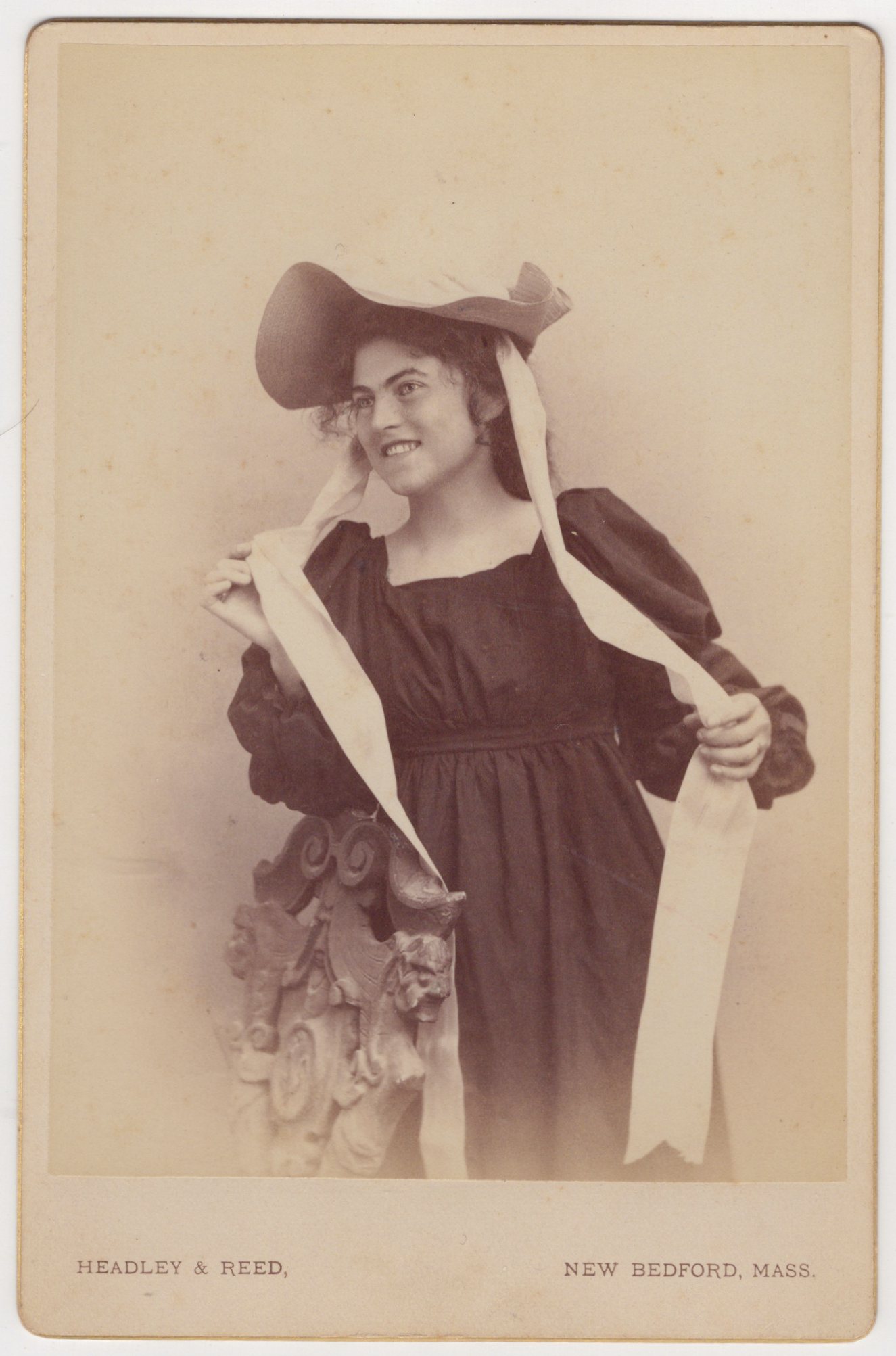 This cabinet card portrait features a fun looking vivacious young woman. She looks pretty and fashionable in her spring like clothing. She is wearing a wonderful hat and a beautiful smile. She shows an excellent and relaxed presence in front of the camera. Perhaps she was a local or touring actress. This young woman’s photograph was taken by the Headley & Reed studio in New Bedford, Massachusetts. The Headley & Reed partnership was an interracial one. Phineas Camp Headley (1858-1921) was a white man while James E. Reed (1864-1939) was an African American man. They operated a studio at 5 Purchase Street. Reed was an important figure in New Bedfords early history. He took photos of city streets, whaleships and people. His human subjects were both white and black. He had a passion for the field of photography and was prolific in his work. By 1895, he was making enough money to open his own studio, which he did with his partner, Mr. Headley. Headley, a white man, besides being a photographer, was a successful cotton broker. Headley & Reed were the premier studio in New Bedford and operated successfully from 1890 until 1896. One of Reed’s claims to fame was that he photographed Frederick Douglas. It is not known why Headly left the business. Reed continued running the business until 1914. Reed moved on to become the first Photostat (photocopier) Operator for the Massachusetts State Archives, a position he held until he retired. During Reed’s photography career, his wife, Anna Jourdain, colorized and tinted his photographs. She also worked on tiffany style lampshades. She was educated in art at the Swain School of Design (New Bedford). SOLD