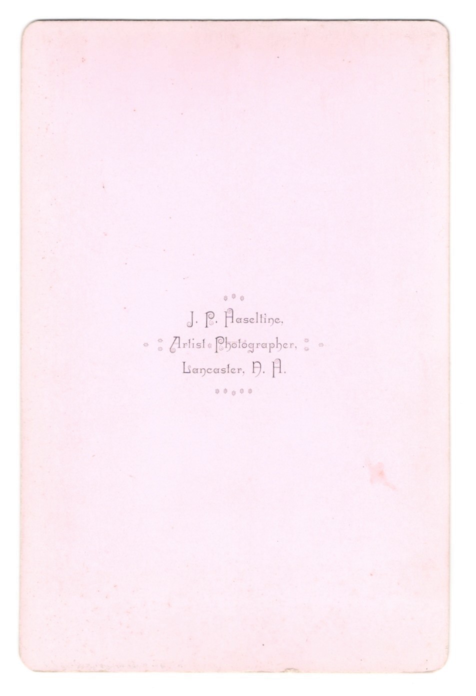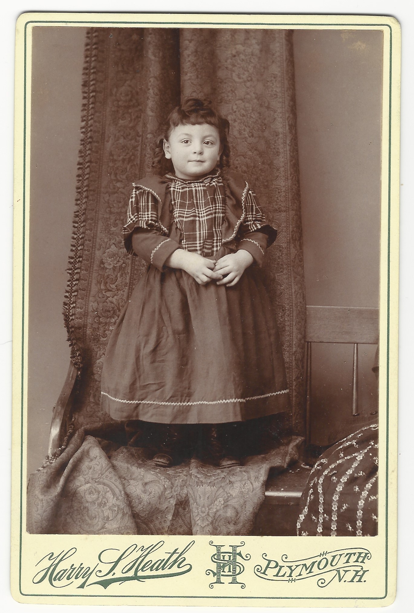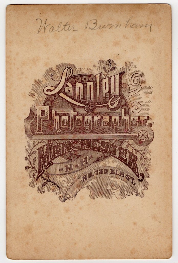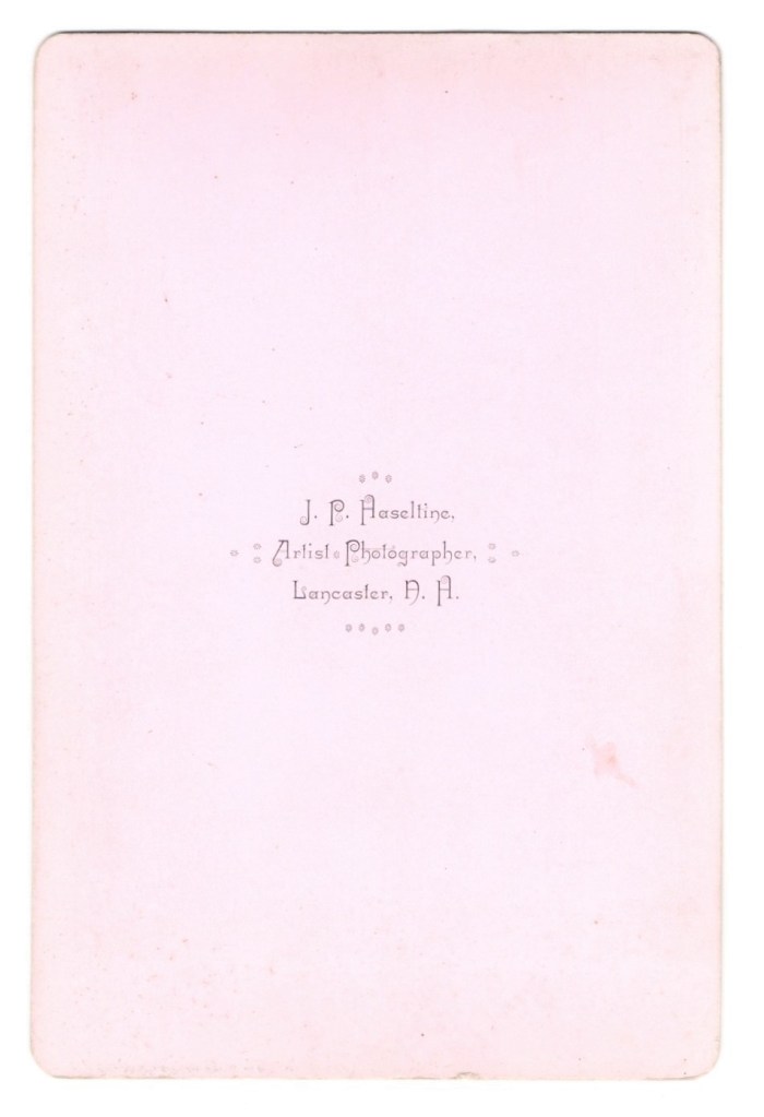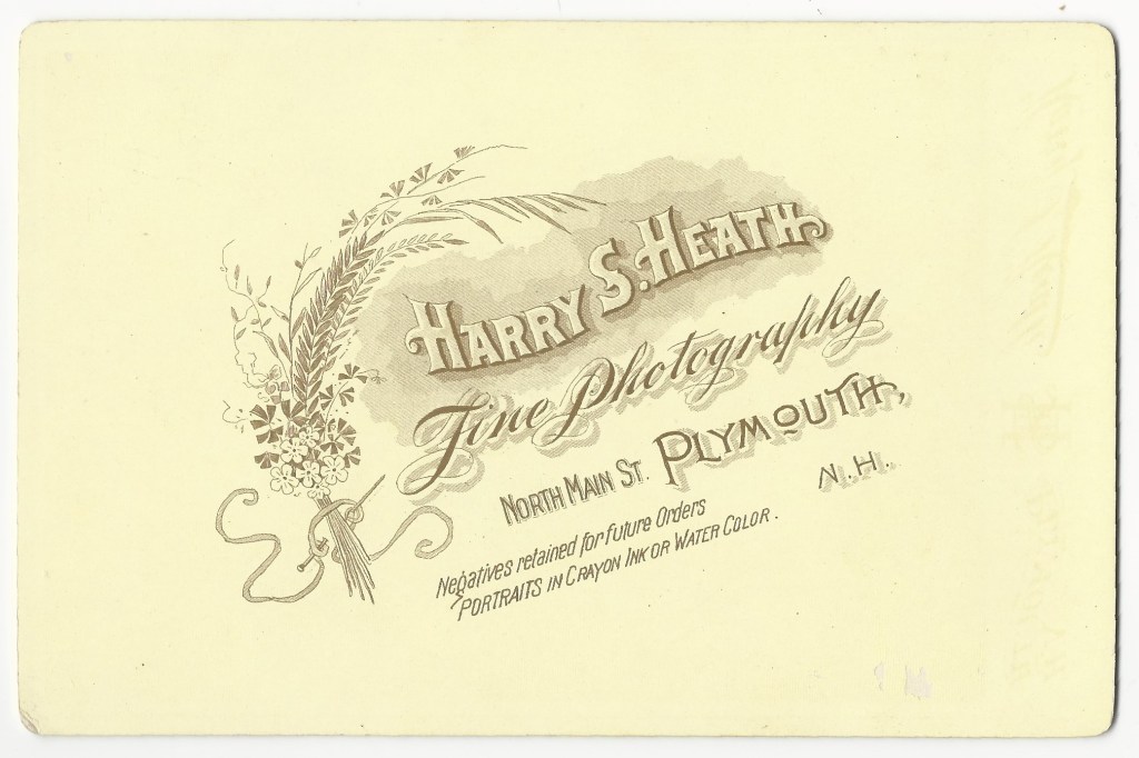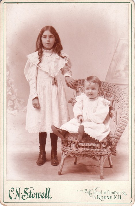 Two sibling pose for their portrait at the studio of C. N. Stowell in Keene, New Hampshire. The reverse of the cabinet card has an inscription that identifies the children as Amy and Dexter Dodge. Photographer, C. N. Stowell is listed in the Keene, New Hampshire business directory of 1897. Amy Lee Dodge (1889-?) was married in 1919 to John Elliott Cook in Keene, New Hampshire. Her father was Willie Alfred Dodge and he mother was Mary Jane Palley. According to city directories, Amy worked as a telephone operator between 1911 and 1920. The 1930 US census revealed that Amy Cook (her married name) was living with her husband, her 4 year-old son, and a few in-laws. Her husbands occupation was listed as “farmer”. Dexter Rudolph Dodge (1896-?) In the 1917 and 1918 city directories (Keene), Dexter is listed as a member of the US Army Reserve. Note that these were the years of World War I and it is unknown whether Dexter actually went overseas and saw combat. The 1920 US census found Dexter working as a clerk in a jewelry store and living with his parents in Keene. In 1921 he married Helen Lucy Winch. Research found a 1942 draft registration card which reported that Dexter owned a jewelry store and was living in Worcester, Massachusetts. City directories from 1951 through 1957 list Dexter as “retired”. This cabinet card portrait has excellent clarity and is in very good condition (see scans).