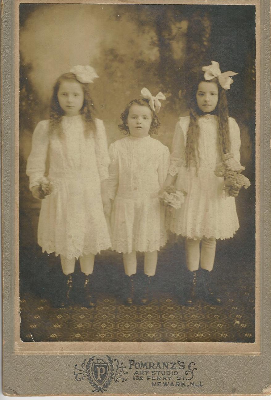 Three young and adorable sisters pose for their portrait at Pomranz’s Art Studio in Newark, New Jersey. Two of the girls have long hair and all three of them are wearing large hair bows. The two older girls are holding flowers. Isadore Pomranz was listed by the US Census as being a photographer in Newark during 1910, 1920, and 1930.