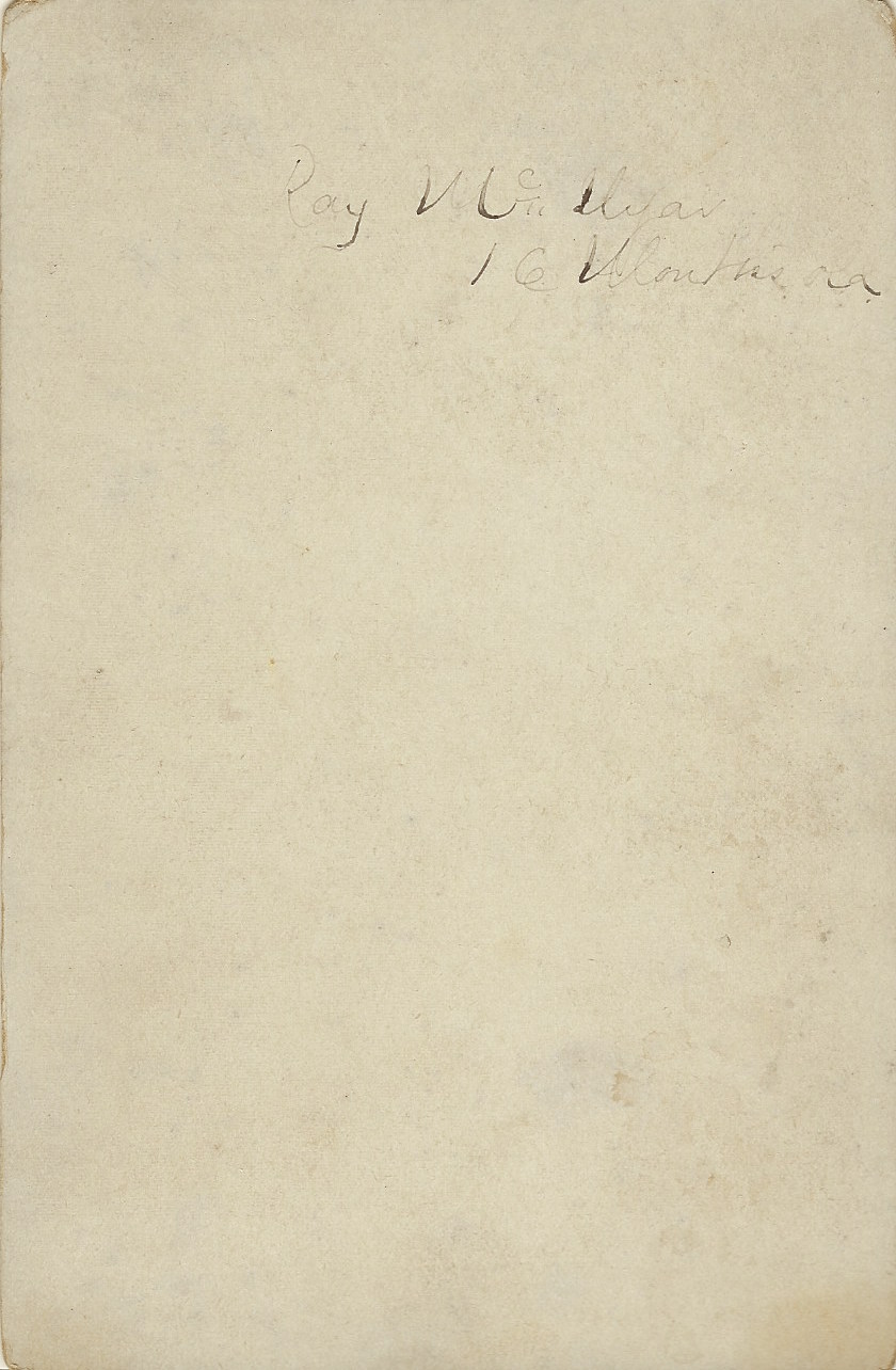 This cabinet card portrait features an adorable baby standing on a chair. The baby is wearing a ring with an attached bracelet. The child looks a bit fearful as she poses at the Chase gallery. The photo studio had three locations, all in Ohio. There were galleries in Newark, Granville, and Thornville. The advertising on the front of the photograph indicates that the photograph was taken in 1893. The reverse of the photograph has an inscription which is difficult to read (see image below). The child’s first name is clearly Ray. Research suggests that the baby is Ray Mc Slyer who was born in Ohio in 1892. Frank Chase (1863-1941) worked as a photographer in Cleveland, Ohio in 1884 and then in Newark between 1885 and a least 1905. He worked in Newark with his father, George W. Chase (1839-1925) except in the mid 1890’s when he operated a studio in nearby Granville.