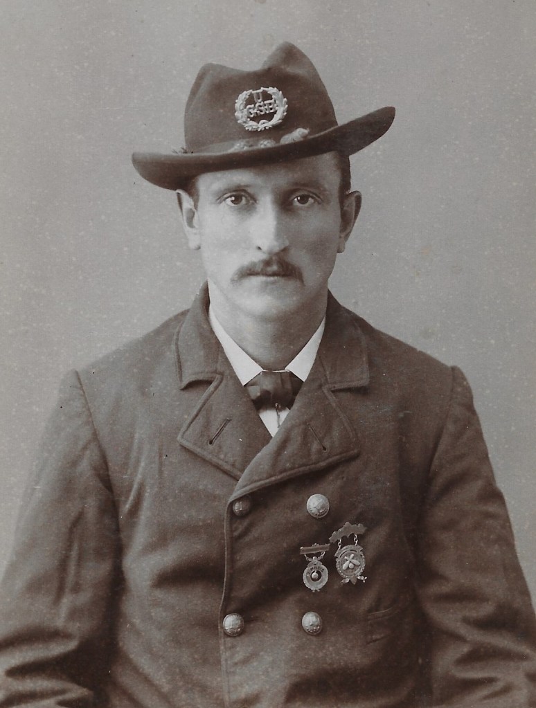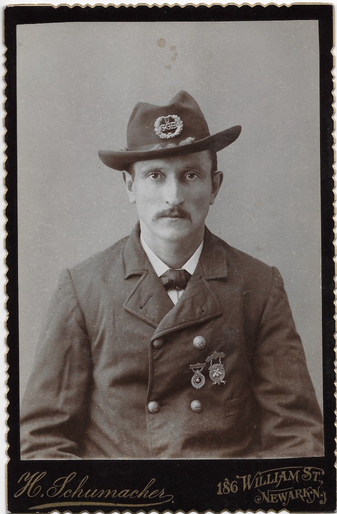 This cabinet card portrait features a gentleman dressed as if he is wearing a military uniform. In reality, this serious looking man is a bowler. The pin on his hat has the letters UGSB. I was unable to identify the full name of the organization. The gentleman is wearing two pins on his jacket, one of which, shows falling bowling pins. The second pin may show a bowling ball. This cabinet card photograph is from the studio of Helmuth Schumacher. He operated his business out of Newark, New Jersey, from 1880 to after 1940. Schumacher was at the William Street address, where this photo was taken, between 1880 and 1897. SOLD