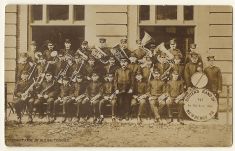 This vintage real photo postcard features a group portrait of the Citizens Band of Newberry, Pennsylvania. The community band members are all wearing full uniforms. This photograph was taken circa 1908. Newberry township is in Lycoming County, Pennsylvania. Newberry is a section of the town of Williamsport which is in central Pennsylvania. Williiamsport has been the home of the Little League World Series since 1947. The photographer of this band portrait is William Henry Holtzinger (1869-1933). Census data as well as Williamsport business directories indicate Holtzinger was a photographer as early as 1898, and as late as 1932. He died of chronic myocarditis in 1933. Two photographs of Mr Holtzinger can be seen below. (SOLD)