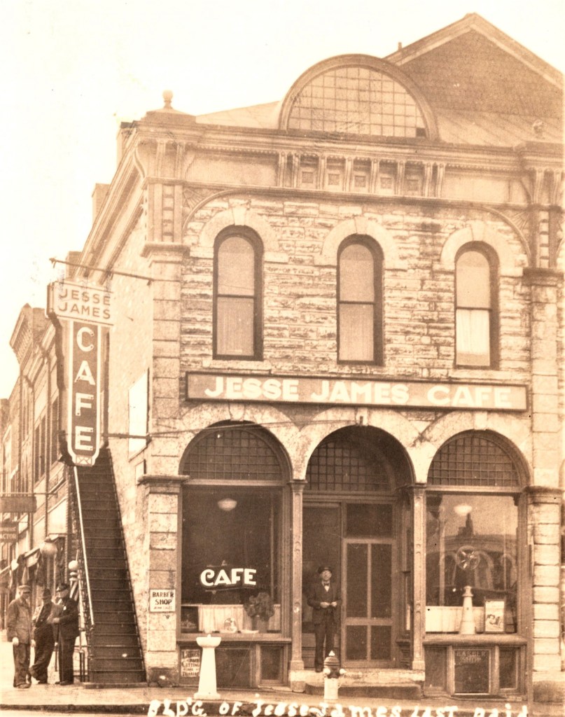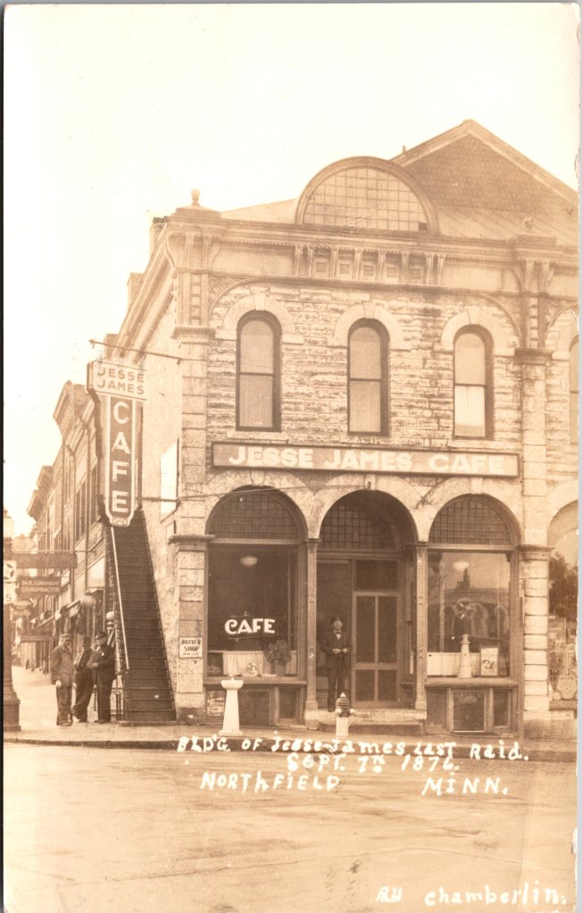 This vintage real photo postcard features a view of the Jesse James Cafe in Northfield, Minnesota. Note the cafe’s sign below the three windows on the buildings second floor. There are also advertising signs evident for a chiropractor and for a barber shop. There is some interesting history attached to the cafe’s building. The building used to house the First Bank of Northfield which was involved in the historic “The Great Northfield, Minnesota Raid”. In 1876, Northfield was a growing Southern Minnesota community. That same year, First Bank of Northfield, became of interest to the notorious gang of bank and train robbers, The James-Younger Gang consisted of Jesse and Frank James; Bob, Jim and Cole Younger, and three others. The robbers rode into Northfield and three of the gang members entered the bank and began the hold-up. Bank employees told them that the safe was locked and could not be opened. When a merchant witnessed the robbery in progress, he warned fellow citizens to arm themselves and fight to stave off the robbers. Gang members outside the bank began to fire their pistols and told the citizens to leave the area. After the ensuing gun fight, two robbers were killed and two were wounded. In addition, the bank cashier was killed when he refused to open the vault. Six of the robbers fled after the failed raid. After some time, the three Younger brothers were captured and another robber was killed in a gun battle. Ultimately, Jesse James (1842-1882) was killed by one of his new recruit gang members. He was killed while standing on a chair dusting off a picture. James was unarmed. His killer was motivated by a reward offered by the Governor of Missouri. This vintage postcard has a 1939 postmark from Northfield, Minnesota. SOLD