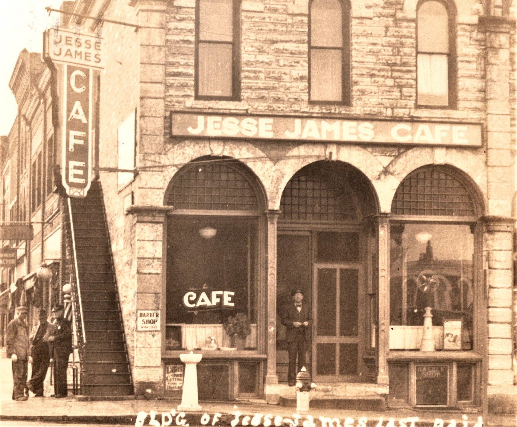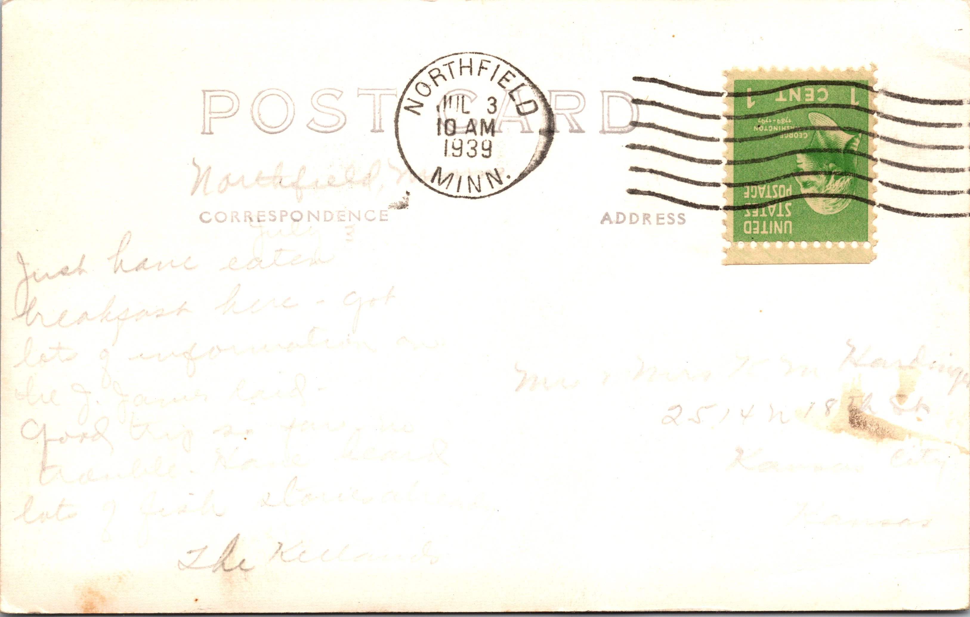 This vintage real photo postcard features a view of the Jesse James Cafe in Northfield, Minnesota. Note the cafe’s sign below the three windows on the buildings second floor. There are also advertising signs evident for a chiropractor and for a barber shop. There is some interesting history attached to the cafe’s building. The building used to house the First Bank of Northfield which was involved in the historic “The Great Northfield, Minnesota Raid”. In 1876, Northfield was a growing Southern Minnesota community. That same year, First Bank of Northfield, became of interest to the notorious gang of bank and train robbers, The James-Younger Gang consisted of Jesse and Frank James; Bob, Jim and Cole Younger, and three others. The robbers rode into Northfield and three of the gang members entered the bank and began the hold-up. Bank employees told them that the safe was locked and could not be opened. When a merchant witnessed the robbery in progress, he warned fellow citizens to arm themselves and fight to stave off the robbers. Gang members outside the bank began to fire their pistols and told the citizens to leave the area. After the ensuing gun fight, two robbers were killed and two were wounded. In addition, the bank cashier was killed when he refused to open the vault. Six of the robbers fled after the failed raid. After some time, the three Younger brothers were captured and another robber was killed in a gun battle. Ultimately, Jesse James (1842-1882) was killed by one of his new recruit gang members. He was killed while standing on a chair dusting off a picture. James was unarmed. His killer was motivated by a reward offered by the Governor of Missouri. This vintage postcard has a 1939 postmark from Northfield, Minnesota. SOLD