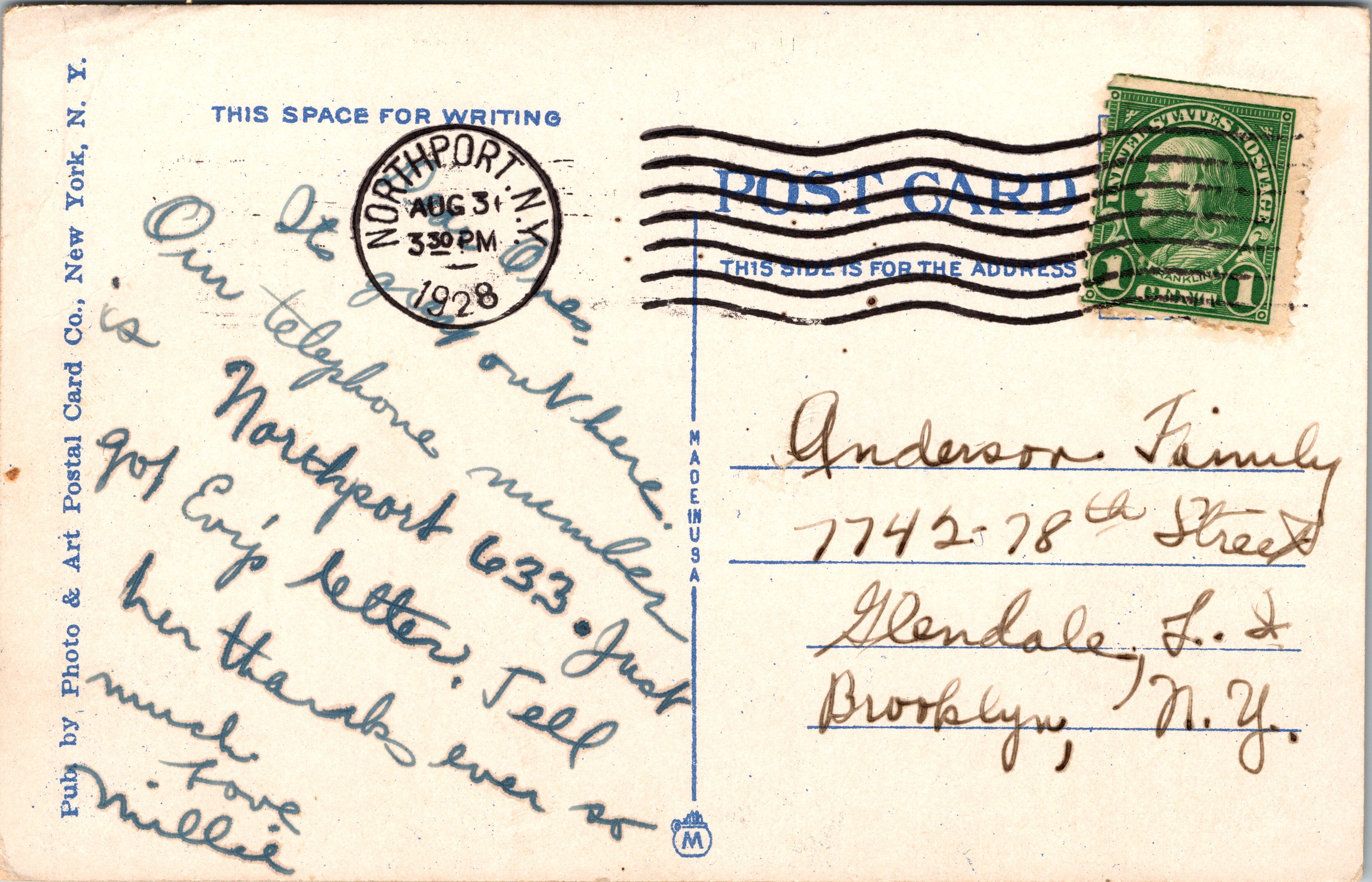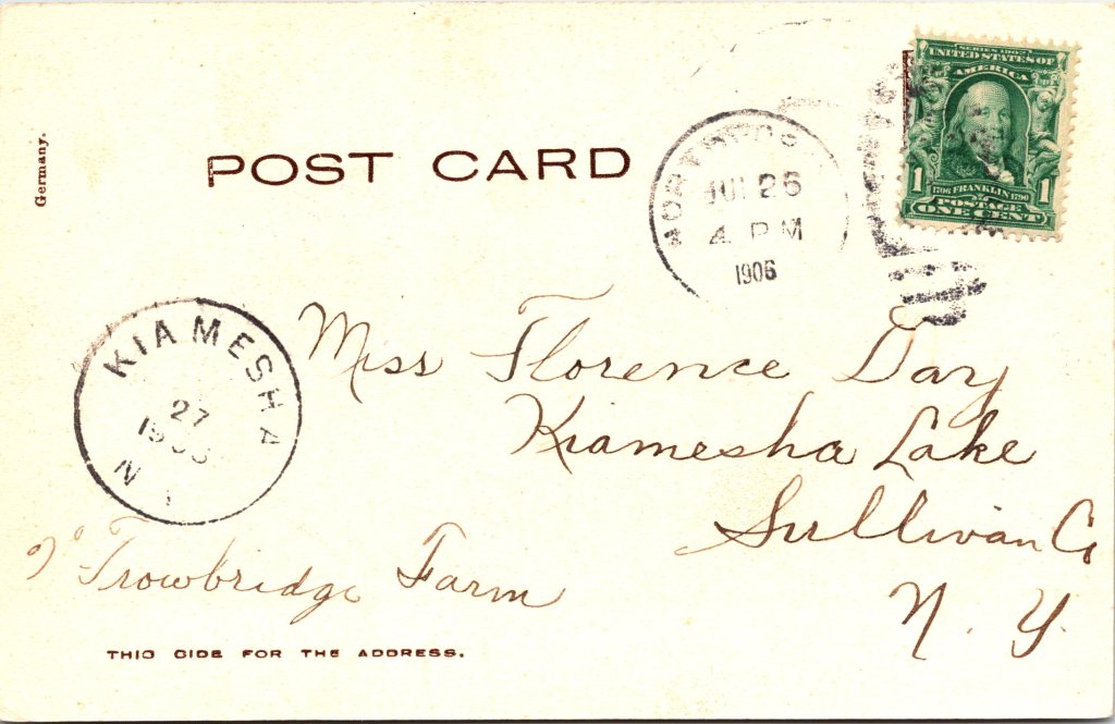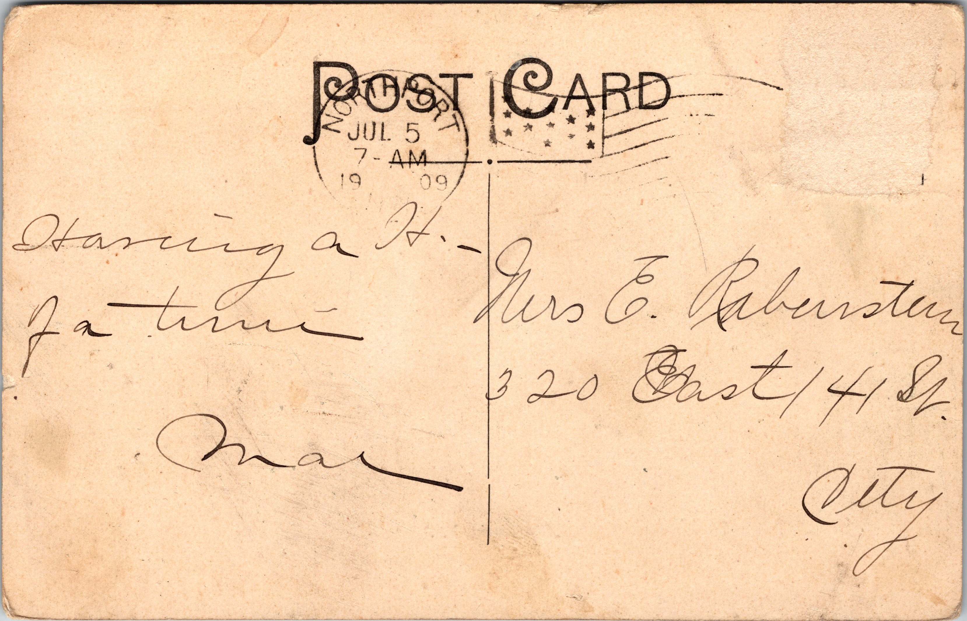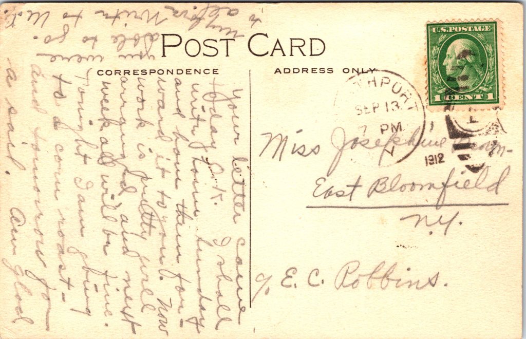 This vintage real photo postcard features American silent film actress, Edith Storey (1892-1967). She was born in New York City and began acting when she was still a child. Her first film was “The Two Brothers” (1908). By 1913, she had appeared in 75 films and between 1908 and 1921 she performed in nearly 150 films. She performed in many Westerns and was noted for her excellent horseback riding skills. She also did her own stunts. She worked for Vitagraph Studios (New York) for the majority of her career. Storey also acted on stage and was noted for acting in a number of male impersonation roles. She appeared in two Broadway plays. The first was in 1903 and the second was in 1904. She retired at the age of 29 in the year of 1921. During the Spanish Flu Epidemic, Storey drove an ambulance in New York City for the National League for Women’s Service. It is also reported that she worked as a hospital night nurse at the height of the epidemic. After retiring she served almost 30 years as village clerk for Asharoken, Long Island. She died at the age of 75 in Northport, Long Island, New York. Within the message on the this postcard, Daisy (the sender) tells Lucille (the recipient) that Edith Storey is her favorite movie actress. A caption on the front of this card states that Storey has brown eyes and dark brown hair. This postcard was published by Kraus Mfg. Co. of New York. (SOLD)