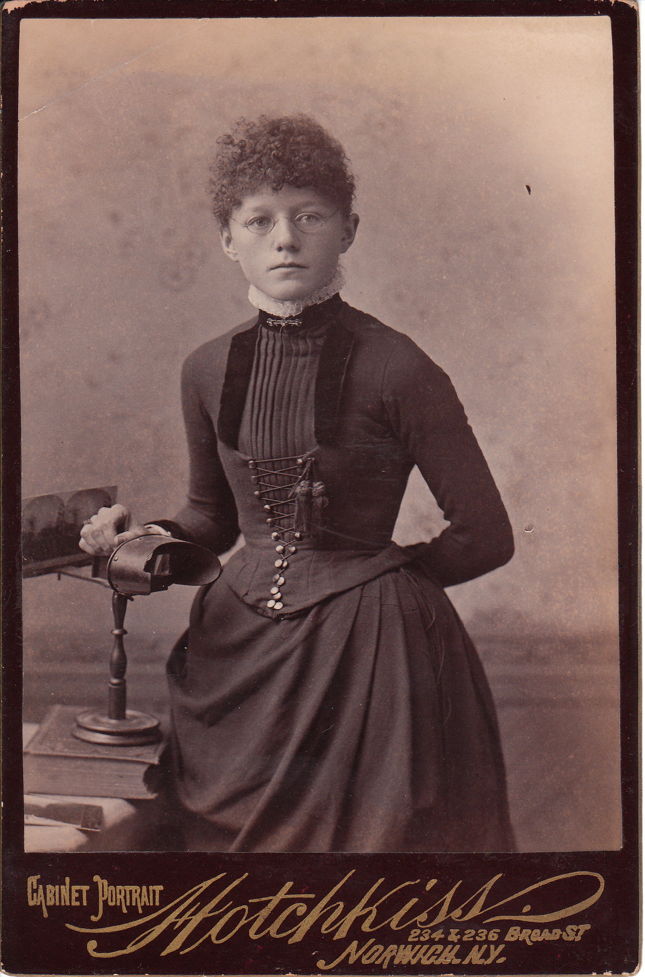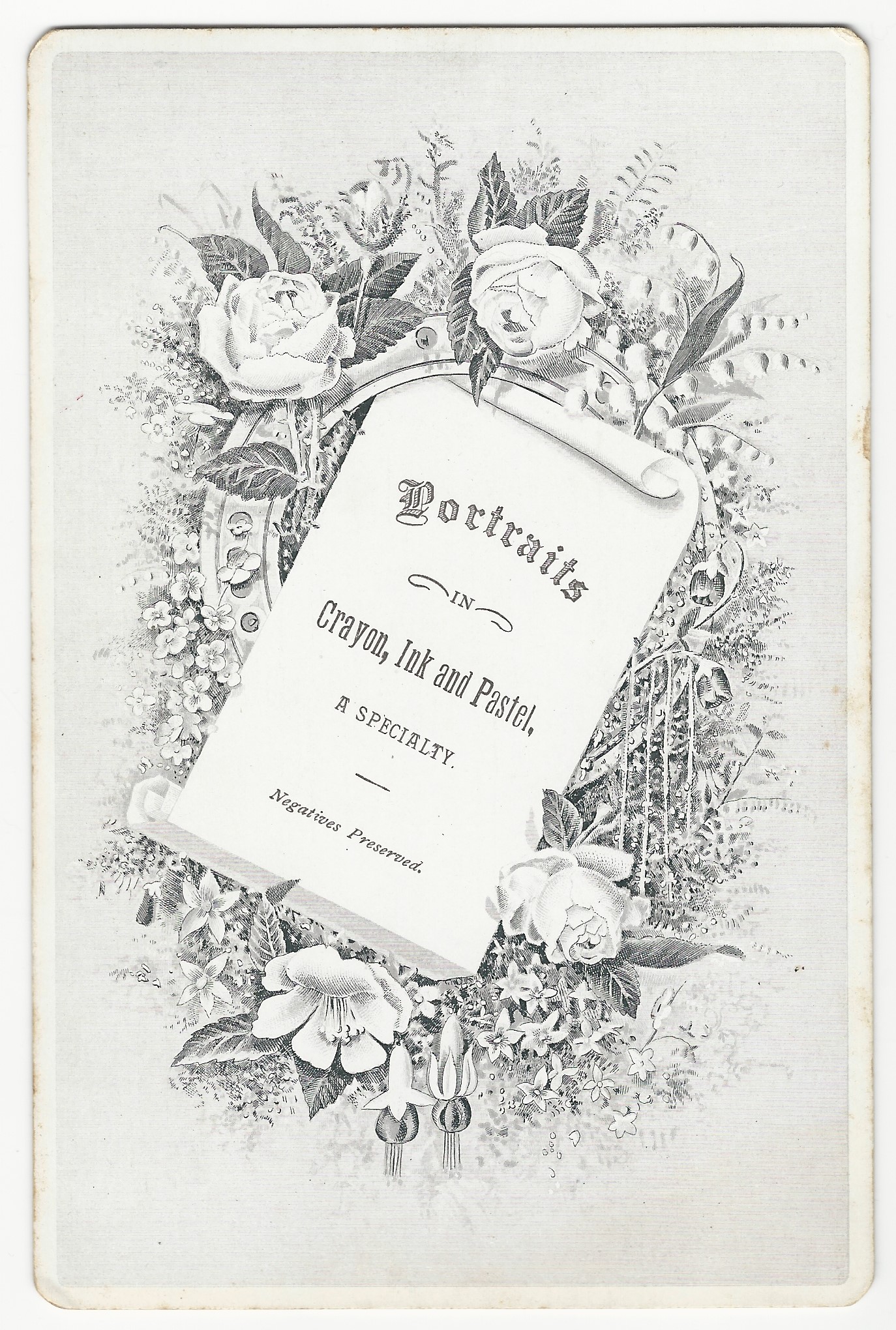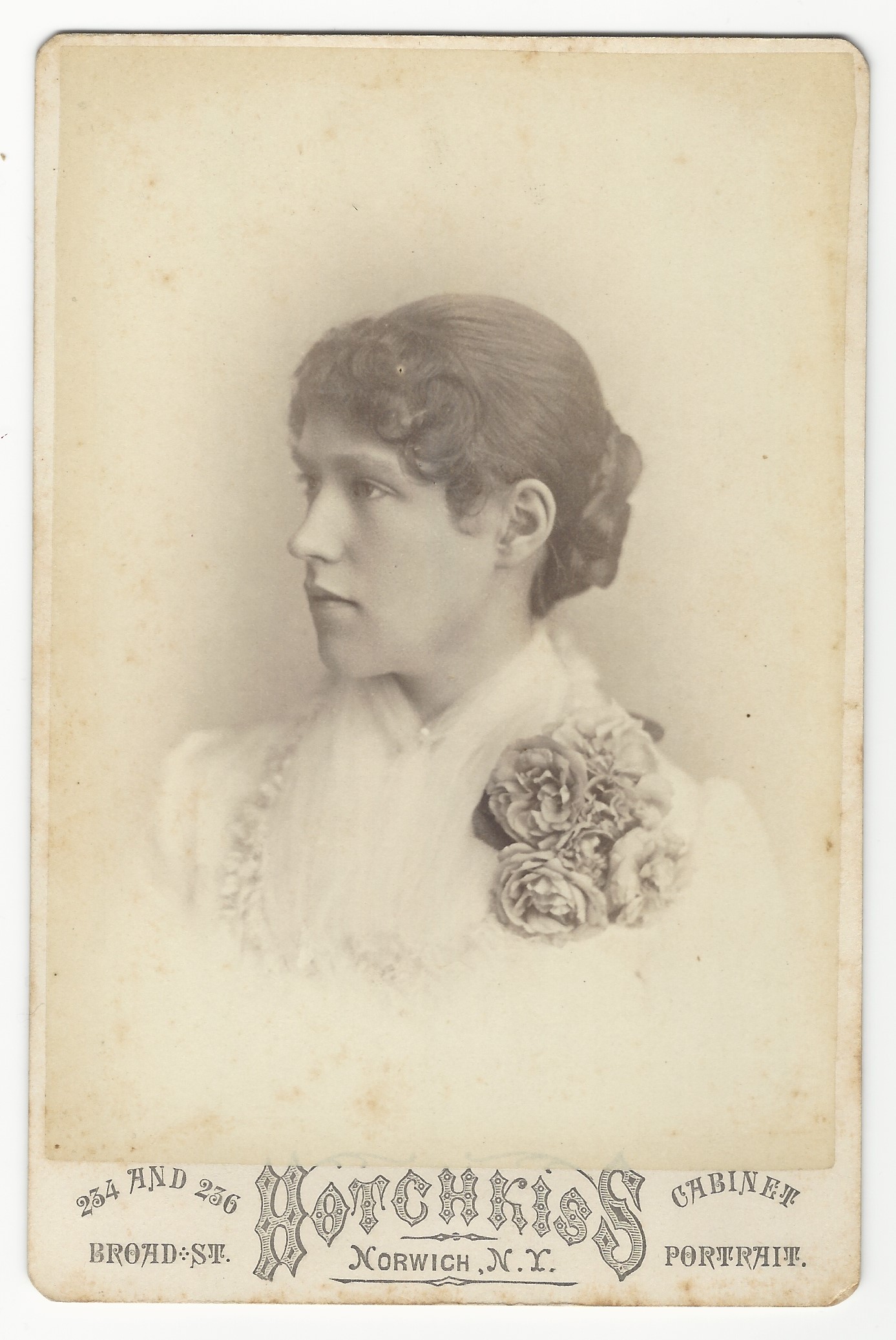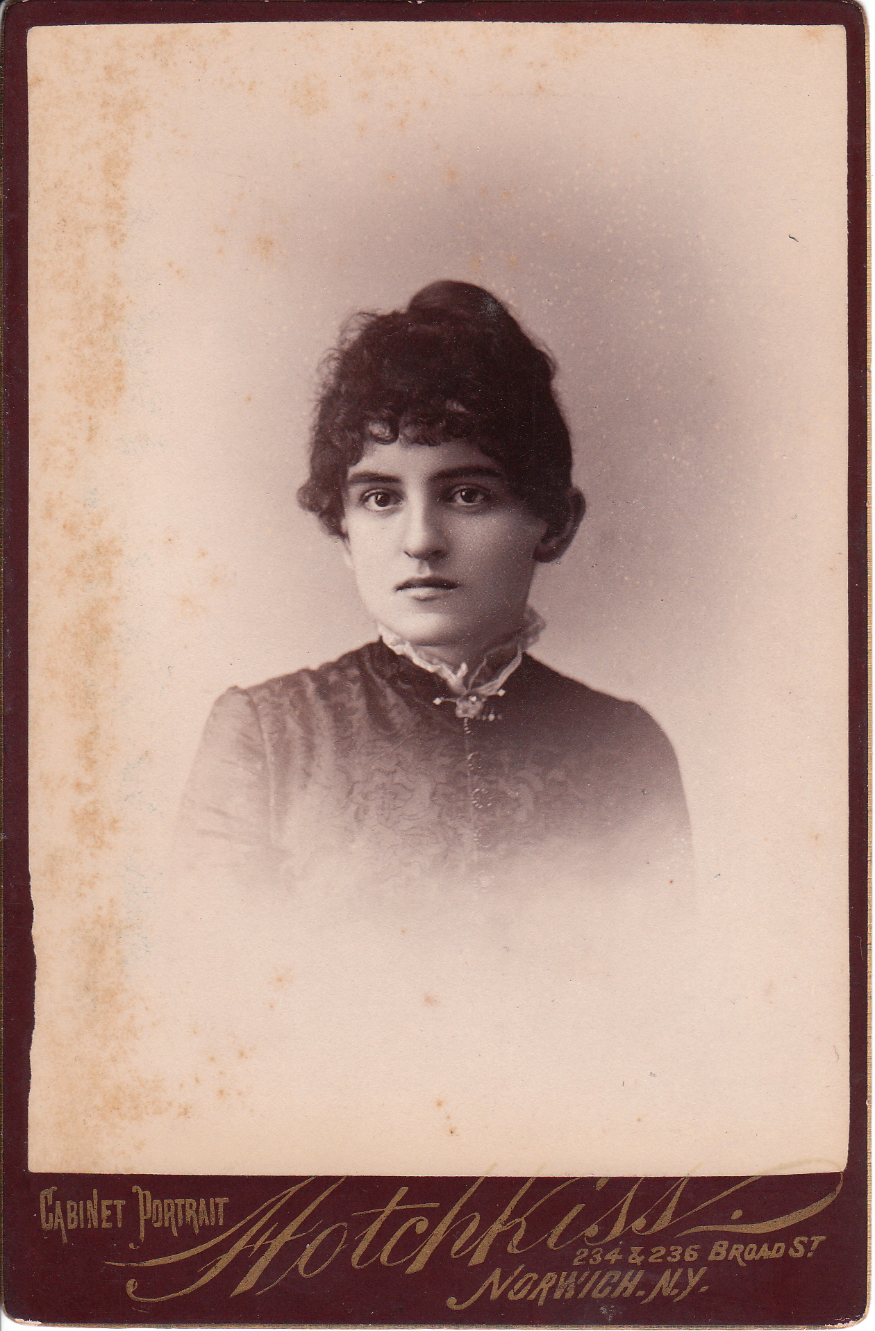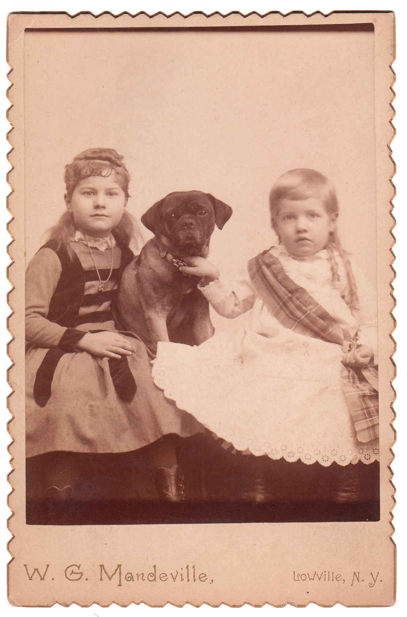 This cabinet card portrait of two children and their pet pug, illustrates the power of the internet in identifying subjects in antique photographs. The reverse of this photograph has some identity clues in an inscription that states “Niles 3 years Grace 6 years Jan 3rd 1889”. Since the photographer of this image (W. G. Mandeville) worked out of Lowville, New York, it was assumed that the children in the photograph lived in, or around, Lowville (located in the western foothills of the Adirondack Mountains). A search of the 1900 U.S. census (Lowville) was done for siblings named Niles and Grace. A listing for Niles and Grace Bateman was found and their ages were a match for the age information on the reverse of the cabinet card. Once establishing their identity, additional biographical data was obtained. At the time of the 1900 census, Grace was seventeen years old and Niles was thirteen. Their father was Carroll Bateman and he was a proprietor of a hotel. Their mother was named Jennie Ruggles Bateman. The 1910 U. S. census found Niles working as a clerk in his father’s hotel. The 1920 U.S. census reveals that Niles had become an “Automobile Agent” and was married to a woman named Vera. The 1930 census discloses some major changes in the life of Niles Bateman. He had two children (Walter and Barbara) and had become an “Automobile Dealer”. The photographer of this image, William Garrett Mandeville (1865-1944), is one of the subjects of Robert Ogden’s book, “Exposing the Wilderness: Early Twentieth Century Adirondack Postcards” (1999). Ogden considers Mandeville one of the best photographers of the genre of scenic postcards. Mandeville was born in New York, dropped out of school at sixteen years of age, and in 1883 went to work for photographer, Ogden Hotchkiss. Hotchkiss had a studio in Norwich, New York. To view photographs by Hotchkiss, click on Cabinet Card Gallery’s category of “Photographer: Hotchkiss”. In 1886 Mandeville joined George W. Carter in operating a photography studio but he left the partnership that same year to run his own gallery. He married his wife, Bertha in 1886 and had a daughter (Dorothy). In the 1930 U. S. census, Mandeville, at 65 years of age, was still listed as a photographer.