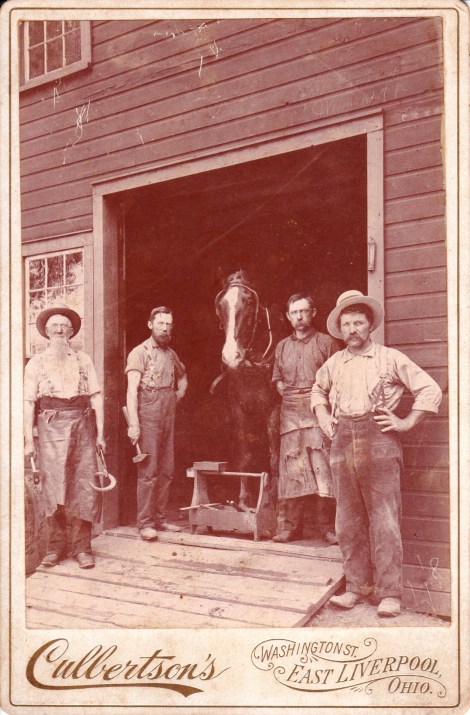 This cabinet photograph looks like a scene from a Clint Eastwood western feature film. It is as if the four men are looking into the street to watch Clint challenge four outlaws to a gunfight. More likely, this photograph captures a portrait of four men who work in an East Liverpool, Ohio blacksmith shop. Note that two of the men are holding  tools of their trade and also take notice that there is a tool box in the center of the image.  In additon, two of the men are wearing aprons and all four men are wearing what appears to be appropriate blacksmith garb. In the center of the photograph is a pretty horse. The photographer of this wonderful portrait is Culbertson’s Art Studio. The Culbertson studio is associated with the seamier side of photography and created quite a scandal in East Liverpool. Harry and Leon Culbertson were brothers and at one point were business partners in the Culbertson Brothers photography studio. On 5/10/1892, Harry was arrested on a charge of taking lewd and indecent photographs. His legal defense was that the photographs were “purely works of art”.The Lowell Daily Courier (Lowell, Massachusetts) reported the story on 5/13/1892. Culbertson claimed that two unknown young woman came to his studio and induced him to photograph them “undraped”.  He left town shortly after his arrest.
