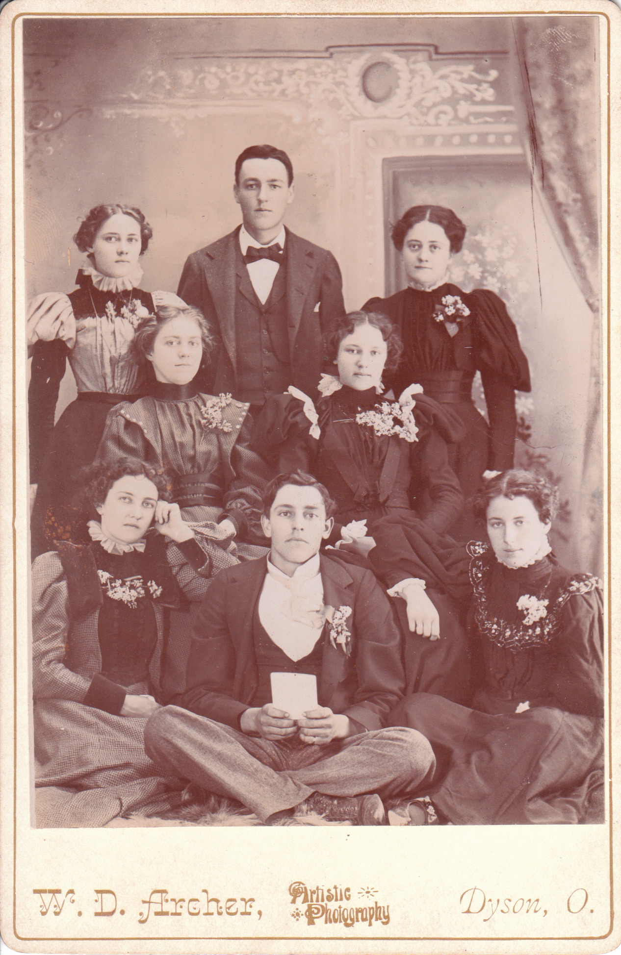 Six young woman and two young men pose for a group photo at the studio of W.D. Archer in Dyson, Ohio. It is possible that this image is a graduation picture. The young man sitting on the floor is holding a piece of paper in his hands. Perhaps the paper is relevant to the reason these eight teenagers are gathered for this group photograph.