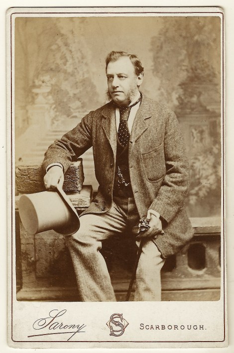 This cabinet card portrait features an elegant gentleman. He is holding his top hat in one hand and a cane in the other. He ill well dressed and judging by his attire, he was a man of means. This photograph was taken in Scarborough, a town in North Yorkshire, England. The photo is from the studio of Oliver Sarony, a well known and commercially successful photographer. His studio had 98 rooms and at one point he had 110 employees. He was born in Quebec in 1820 and he came to England in 1843. He worked as a photographer in several English towns until he settled in Scarborough in 1857. He died in 1879. The business continued into the 20th century under the name Sarony & Co. The business was initially managed by Samuel Waind Fisher the husband of Oliver’s niece, Jennie. Interestingly Jennie was the daughter of Napoleon Sarony, the talented and well known celebrity photographer located in New York City. Note the inscription on the reverse of the photograph. The name of the signee appears to be “Tillis” and the inscription is dated “1877”. This cabinet card is in very good condition (see scans).
