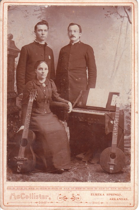 Eureka! This cabinet card is an addition to the rapidly expanding Salvation Army category of the Cabinet Card Gallery. This image is of a three member musical group and three of their musical instruments. The instruments include a portable organ, a guitar and what appears to be, a banjo or another type of string instrument. The band members are in their Salvation Army Uniforms. One gentleman is wearing a badge on the front of his jacket and the second gentleman has a “S” pin on the collar of his jacket. The woman in the band appears to be wearing a badge over the top button of her blouse. The photographer is Spencer McCollister of Eureka Springs, Arkansas.