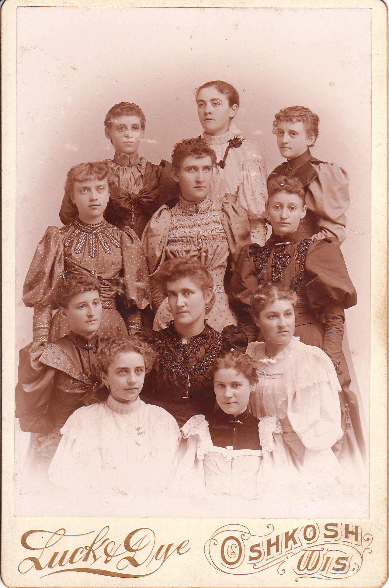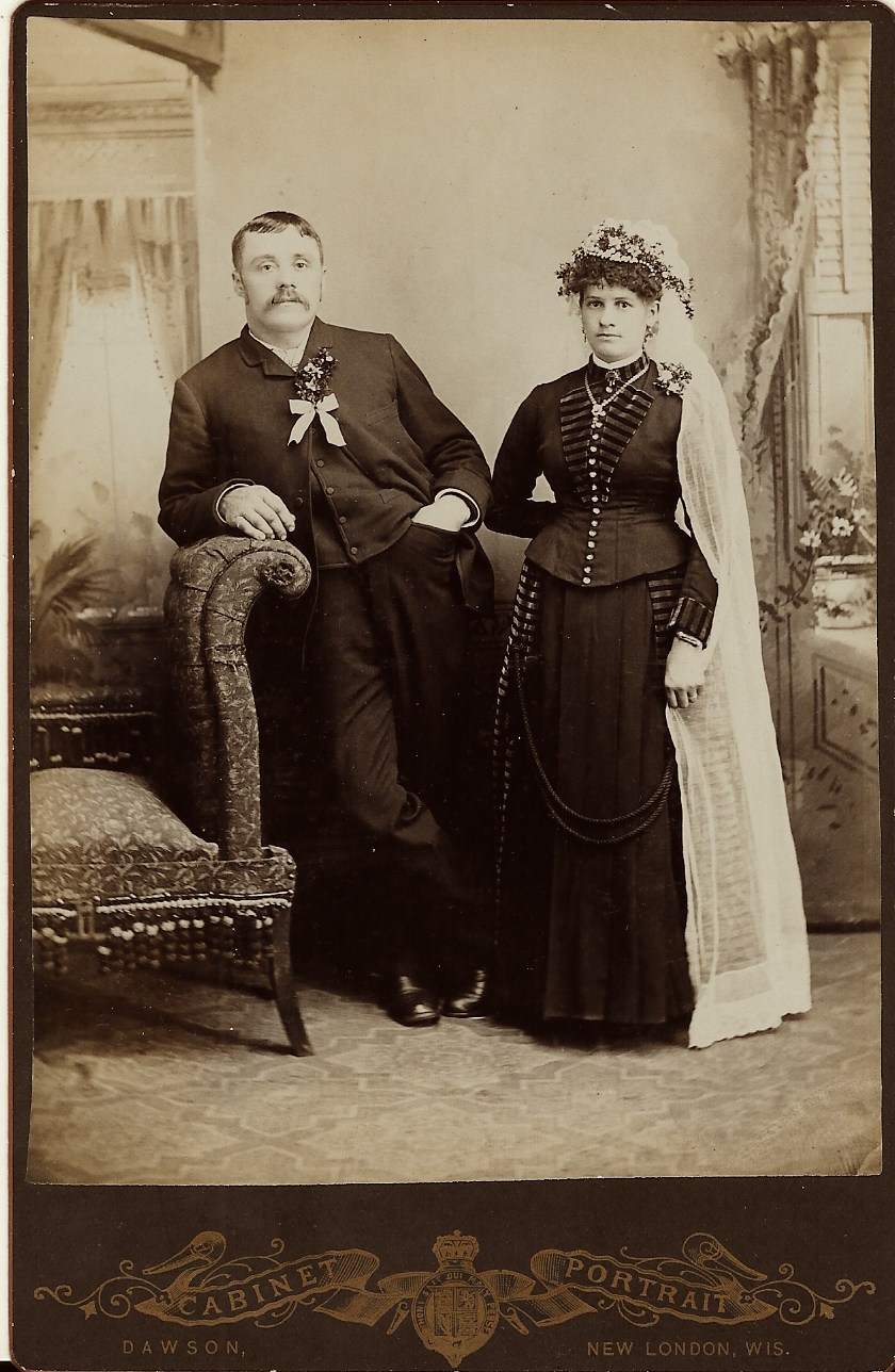 This cabinet card features three very cute young children; presumably, they are siblings The girls are wearing jewelry. The girl on the left of the image is wearing a necklace and the girl on the right is adorned with a necklace, choker, and earrings. The young lad in the center is wearing a large bow tie and is dressed in the fashion of “Little Lord Fauntleroy”. The lad is holding a flower. The photographer of this image is Gustavus Timm (1867- ?). He operated photographic studios in Oshkosh, Wisconsin between 1895 and 1924. He was located at four different addresses while he was in business. The address on this cabinet card indicates that at the time of this photograph, he was located at the site of his first studio. The address on this photograph reveals that it was taken between 1895 and 1898. Gustavus Timm was married to Jennie Timm, who was ten years his junior. They married in 1895. The 1920 U. S. census data discloses that the couple had at least two children; Rhea (age 22) and Ralph (age 11).