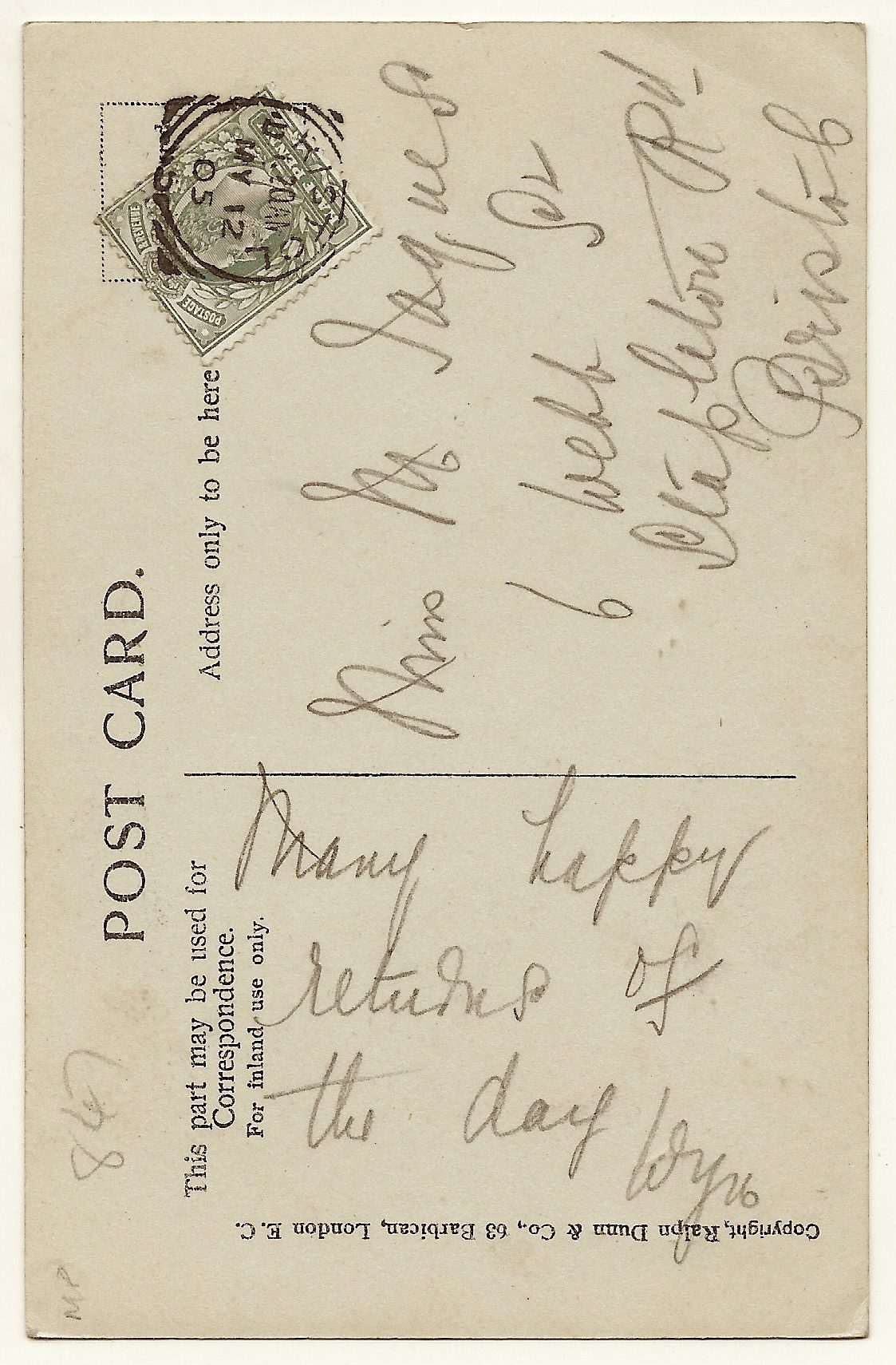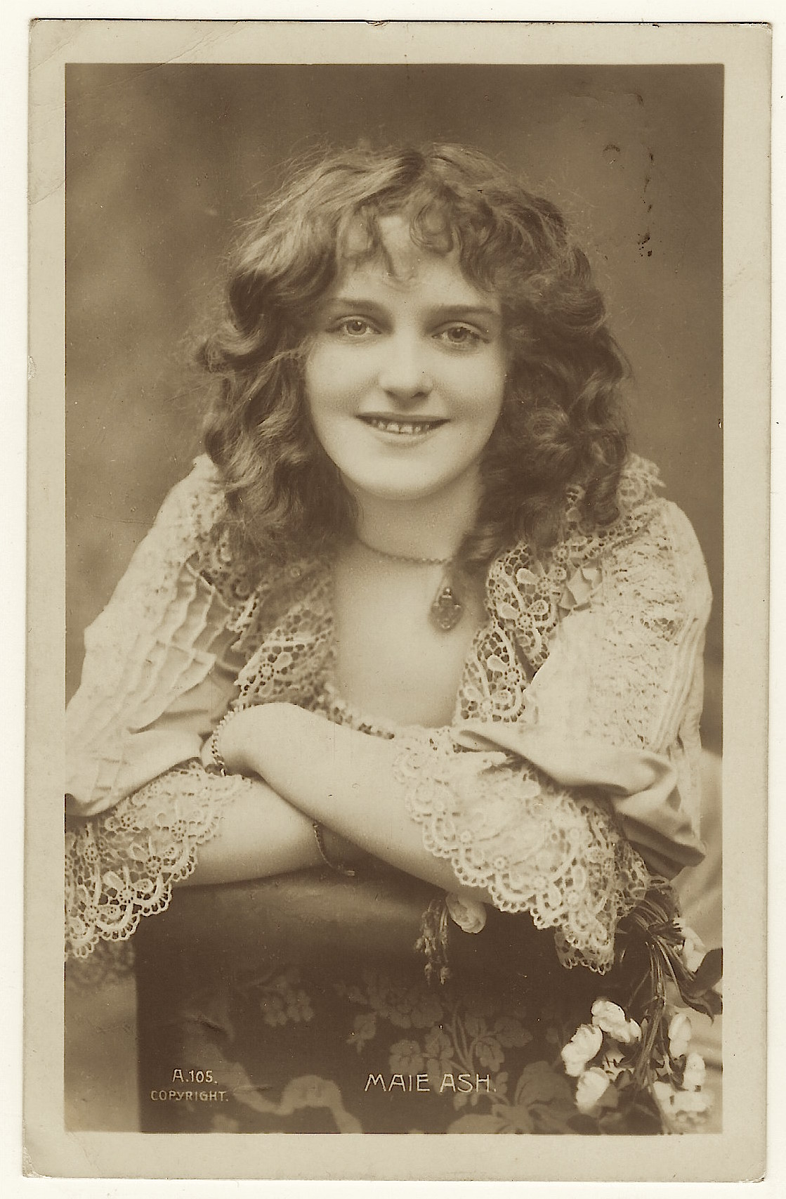 This vintage real photo postcard features a striking portrait of Jean Aylwin (1885-1964), a pretty British actress and singer from the early 20th century. She gained fame for her performances in musical comedies and plays in London and she also toured internationally. Aylwin was associated with the popular Gaiety Theater productions. She had notable performances in several successful productions including “The New Aladdin” (1906), “The Girls of Gottenberg” (1907) and “Our Miss Gibbs” (1909). Aylwin also appeared in two silent films. She married in 1913 but the marriage ended in divorce in 1924. She was accused of adultery with a noted composer of her time. After her divorce, her career declined. She later worked as a housekeeper. In 1926, she briefly worked as a BBC radio broadcaster. Aylwin looks elegant in this dramatic studio pose. She stands three-quarter length with a thoughtful, hand-to-chin expression, the other hand set firmly at her hip. Aylwin wears a striking military-style costume—a fitted jacket heavily braided with ball buttons and tasselled cords, over a pleated skirt; a matching hat rests at her side. Her hair is dressed in full Edwardian waves, completing the theatrical look. Thd photographer of this portrait is the Dover Street Studios. The card was published by Rotary Photo as part of a series (no1898K). The postcard has a Wandsworth (London) postmark from 1908. The postcard is addressed to someone in West Australia. The message on the card is “This is rather a pretty girl. I have seen her in a piece called Havana. Jack.” The front of this card is has rich, sharp sepia tones. Holding the card at a certain angle, one can see dimples caused by the postmark. (SOLD)
