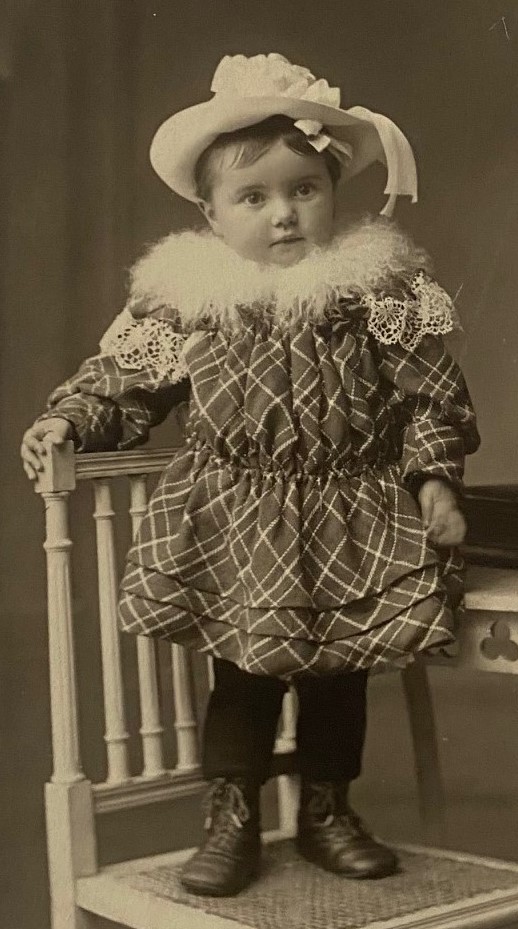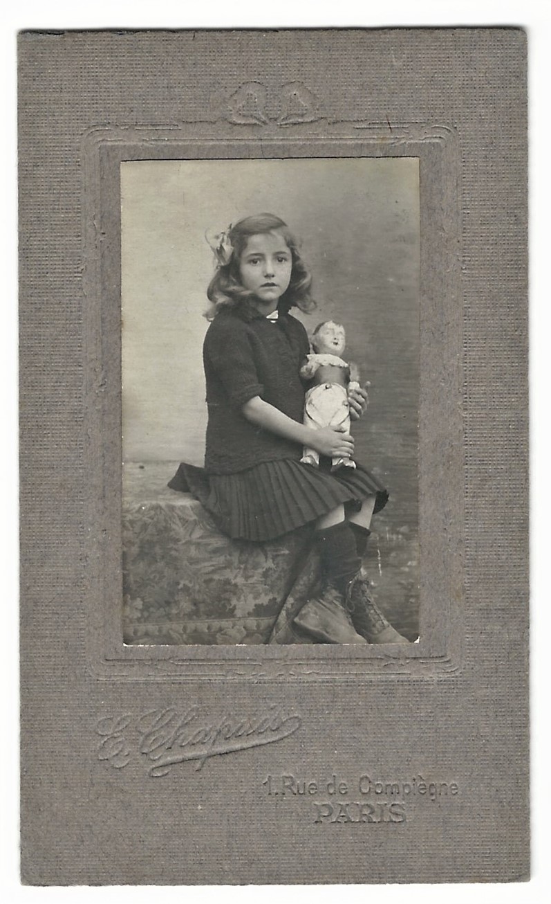 This vintage photograph features and adorable little girl sitting on a wall and holding her doll for all to see. I know very little about dolls, but, this one seems to be made out of wood. This photo was taken at a studio in Paris, France. The photographer was E. Chapuis. Preliminary research yielded no biographical information about Mr. Chapuis but he appears to have been a prolific photographer based on the number of his photos that are in the hands of collectors. This photograph measures about 2 1/4″ x 3 7/8″. SOLD