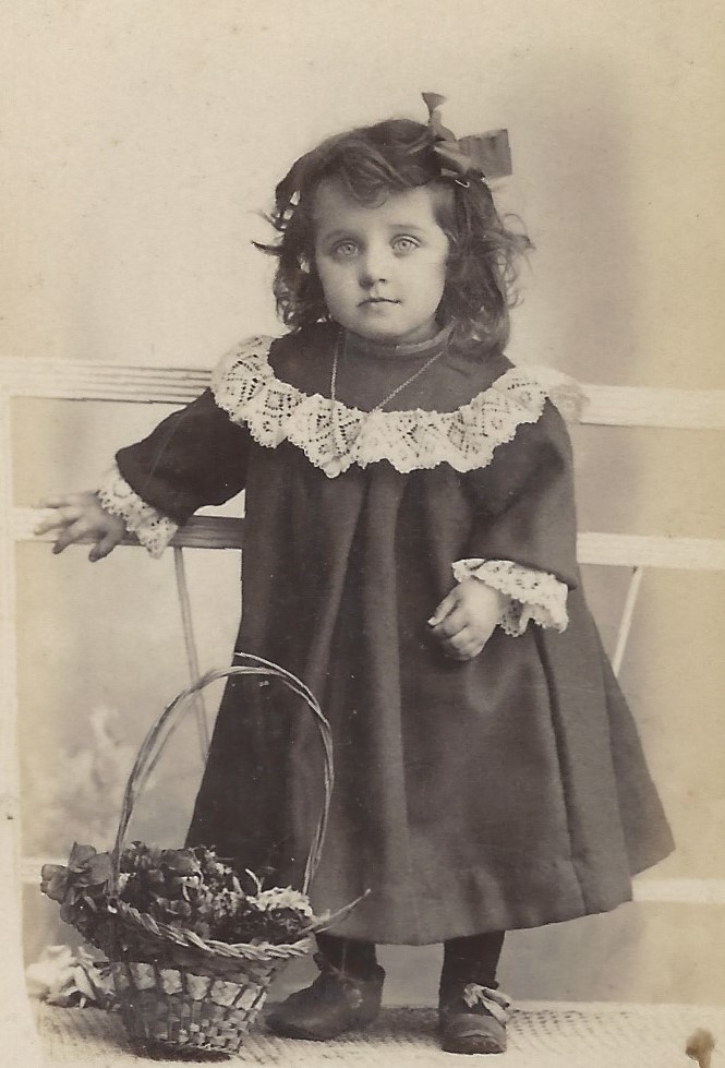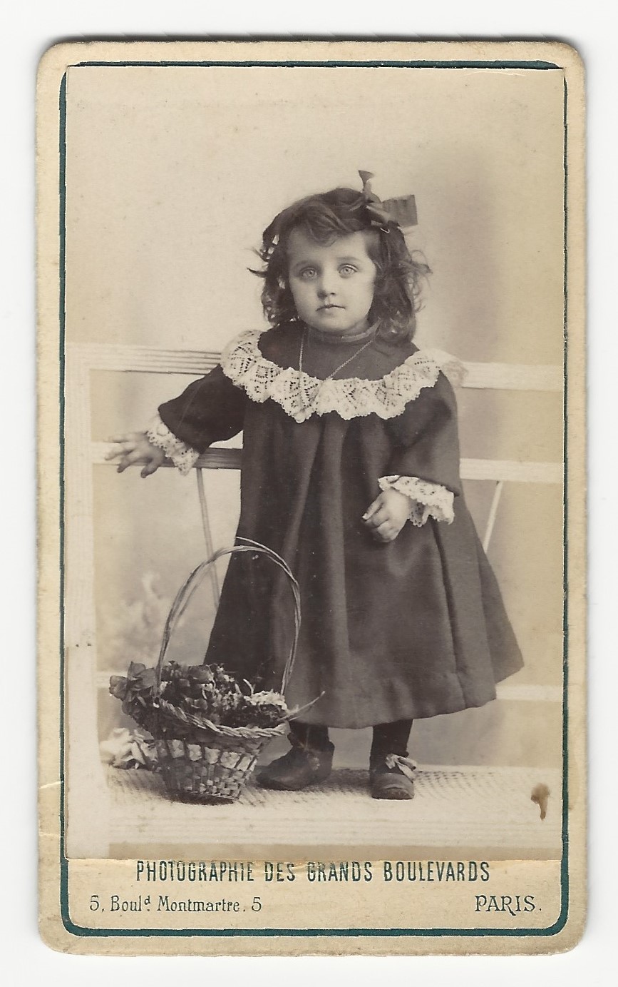 This cartes de visite features a very pretty little girl standing beside a basket of flowers. She is wearing a necklace, a lace bib and lace at the end of her sleeves. She has a bow in her hair and bows on her shoes. This adorable little girl’s portrait was photographed by Photographie Des Grandes Boulevards in Paris, France. SOLD