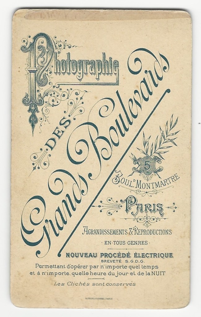 The photograph seen on Cabinet Card 1 was taken by celebrated photographer Felix Nadar. Rejane is quite pretty and very fashionable in this portrait. Judging by the address on the bottom of the cabinet card, it appears that Nadar’s studio was inside a hotel.