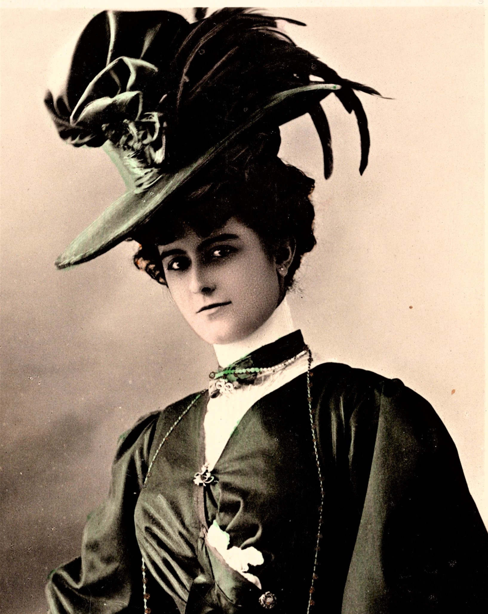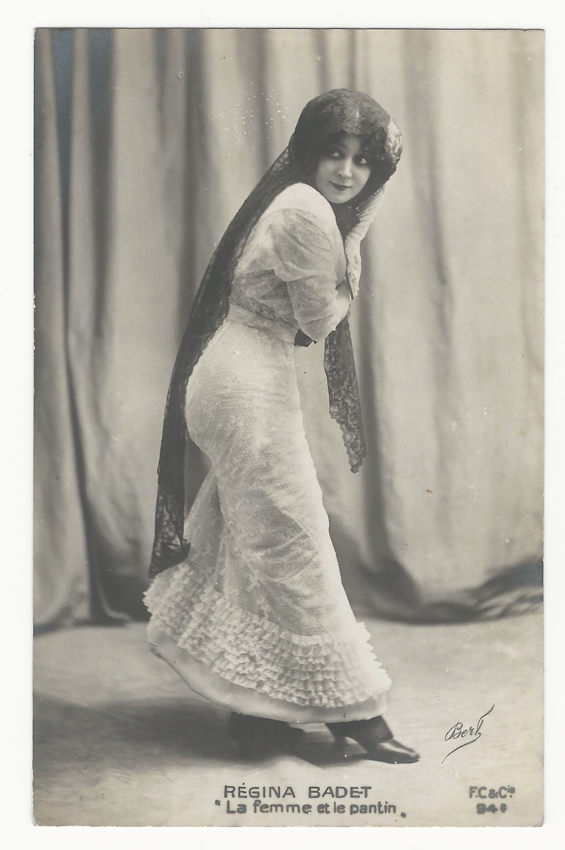 These vintage real photo postcards feature French actress and dancer, Anne Regina Badet (1876-1949). She was a major star of the Opera-Comique in Paris. She made her debut at the Grand Theatre de Bordeaux where she became a principal dancer She received much acclaim for her portrayal of Conchita Perez in “The Woman and the Puppet (1910)”. Postcard 1 shows her in this role. Her stage acting led her to a brief film career (eleven movies between 1908 and 1922). The Los Angeles Herald (1906) described Badet as the “new Paris pet” and that her dances in the Opera “Aphrodite” had “caused a furor among theater goers. A critic wrote that he went to see the performance because the opera was a “masterpiece” and because he wanted to see the star soprano, Mary Garden, interpretation of her role. Instead, he reports he was most drawn to the performance by Regina Badet. Miss Badet retired from stage and screen in the early 1920’s.