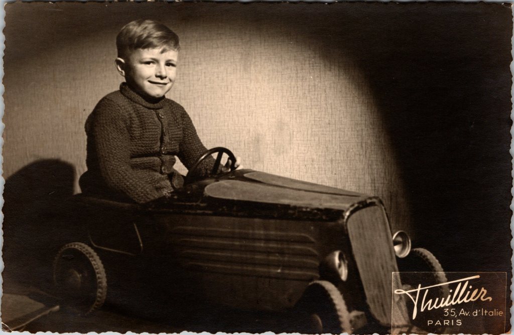 A LITTLE BOY SITTING IN HIS TOY PEDAL CAR