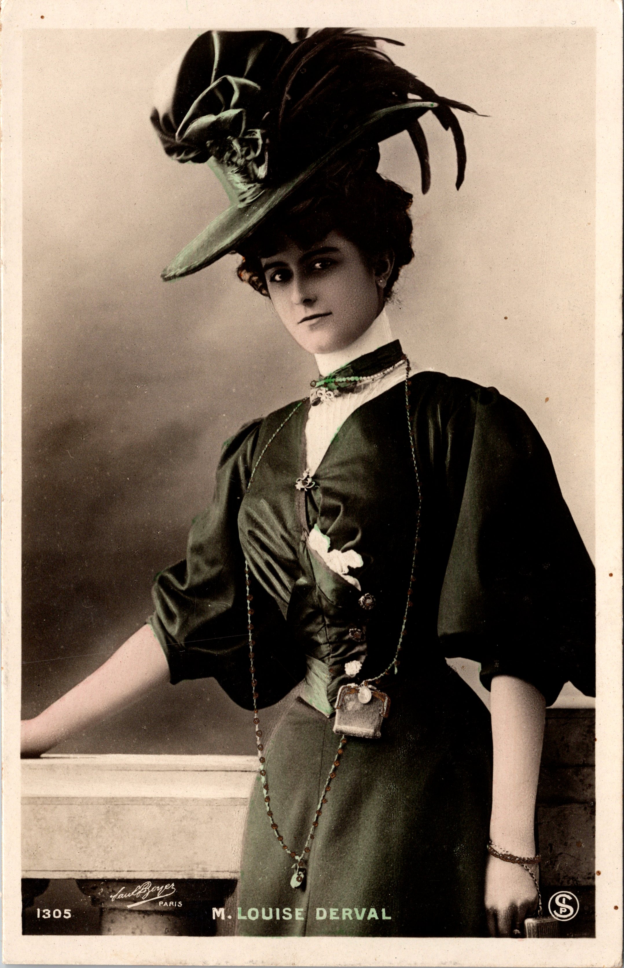 This vintage real photo postcard features performer, M Louise Derval. Miss Derval looks pretty and fashionable. Note her elegant green gown, large fancy hat, long necklace, and small coin purse. Pablo Picasso drew a pen and brush portrait of Derval. It was one of four illustrations of Paris Entertainers drawn from sketches made in Paris theaters and cabarets. The portrait drawn in 1901, is now in the collection of the Morgan Library and Museum in New York City. This postcard was published by S.I.P. as part of a series (no.1305). Miss Derval’s photo portrait was taken by the well known celebrity photographer, Paul Boyer. His studio was located in Paris, France. This postcard is in very good condition (see scans).