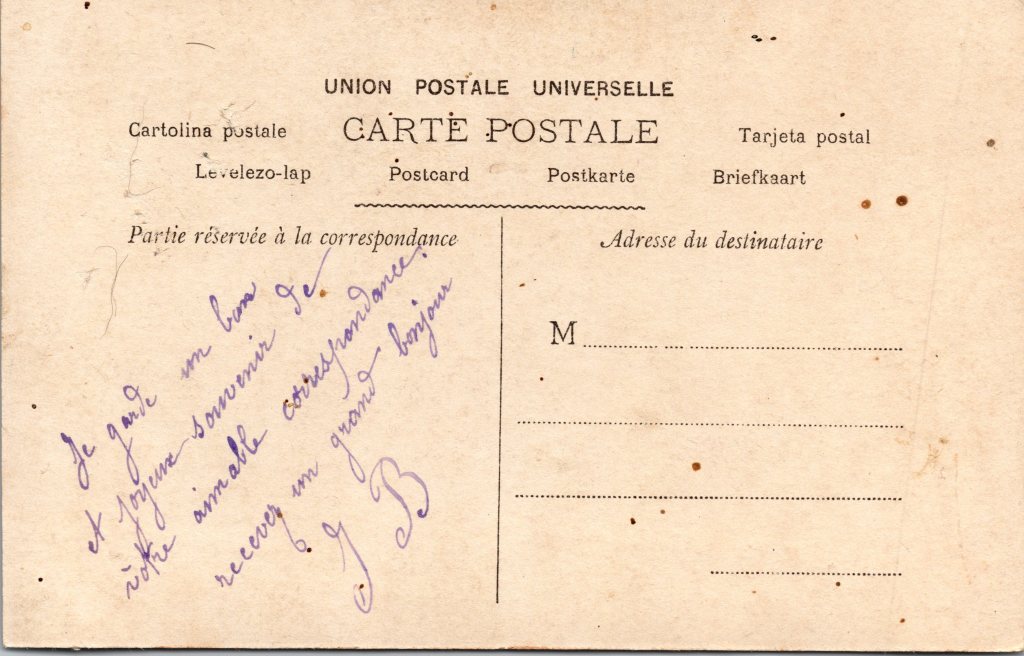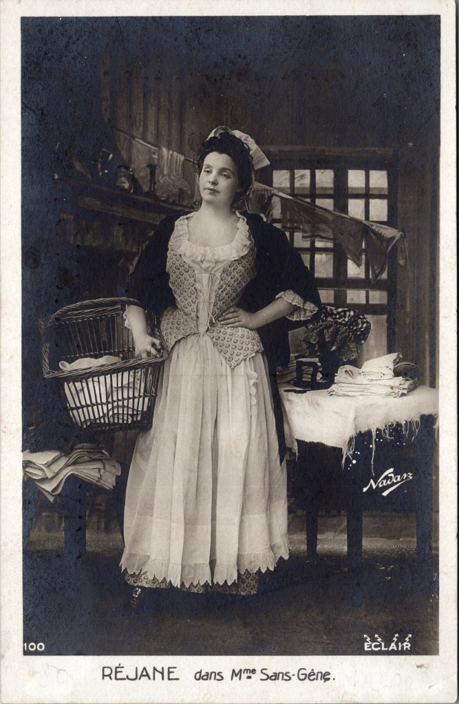 Postcard 1 features French theater and film actress, Gabrielle Rejane. This was the stage name employed by Gabrielle-Charlotte Reju (1856-1920). She was born in Paris and had theatre in her blood as her father was an actor. She studied under Regnier at the Conservatoire and excelled in comedy. She made her debut in 1875 playing a number of “soubrette parts. Her first major success was in Meilhac’s “Ma Camarade (1883) and she quickly became known as a talented emotional actress. She played roles in “Decor”, “Ma Cousine”, and “Lysistrata”. In 1892 she married M. Paul Porel, the director of the Theatre du Vaudeville. The marriage lasted twelve years. In 1893 she appeared in Paris and soon thereafter she appeared in her most famous role as Catherine in Sardou’s “Madame Sans-Gene” in London and New York. In 1906 she opened the Theatre Rejane in Paris. She and Sarah Bernhardt served as the models for the character of the actress Berma in Marcel Proust’s novel “In Search of Lost Time”. Gabrielle Rejane’s acting is thought to represent what wikipedia describes as “the essence of French vivacity and animated expression”. Rejane appeared in a number of short films during the pioneering days of early cinema. Réjane died in Paris and is buried in the Cimetiere de Passy. Her obituary appeared in the New York Times (1920) and it was chock full of praise including; “She was the supreme comedienne of her time.” The image of Me. Rejane seen on this postcard was taken by celebrated and talented Paul Nadar (1856-1939).He was a French photographer. He learned photography by his father, Felix Nadar, also a talented portraitist. Paul eventually ran his father’s studio. The establishment catered to a affluent clientele and was very successful. The word “Eclair” appears in the bottom right hand corner of the photo. The Eclair Company was a movie production company established in 1907 and headquartered in Paris. (SOLD)