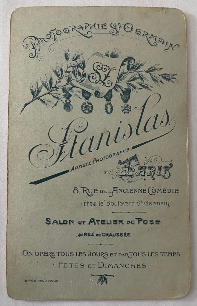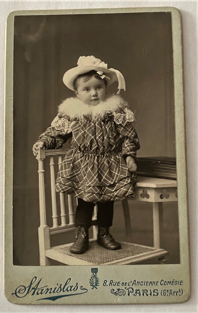 This carte de visite portrait features a most adorable little girl. Someone, likely her mother, has dressed her beautifully. She is standing on a chair without any assistance. There is no belt or hiding mother holding her in place. This cdv photograph was produced by the Stanislas studio in Paris, France. (SOLD)
