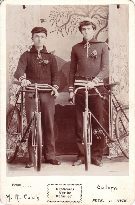 This cabinet card photograph captures two young men posing with their bicycles. They are wearing similar and unusual outfits. it looks like they are wearing the predecessor to “hoodies”. However, rather than hoods, it appears that they are wearing capes. Both guys are also wearing flowers pinned to their chest. Are these fellows about to ride in a parade? Are they wearing typical bike riding outfits? Hopefully, a visitor to the cabinet card gallery will leave an informative comment concerning the subjects outfits. The photographer of this image is M. R. Cole of Peck, Michigan. Cole is listed in a 1904 Michigan directory as a photographer and a jeweler.