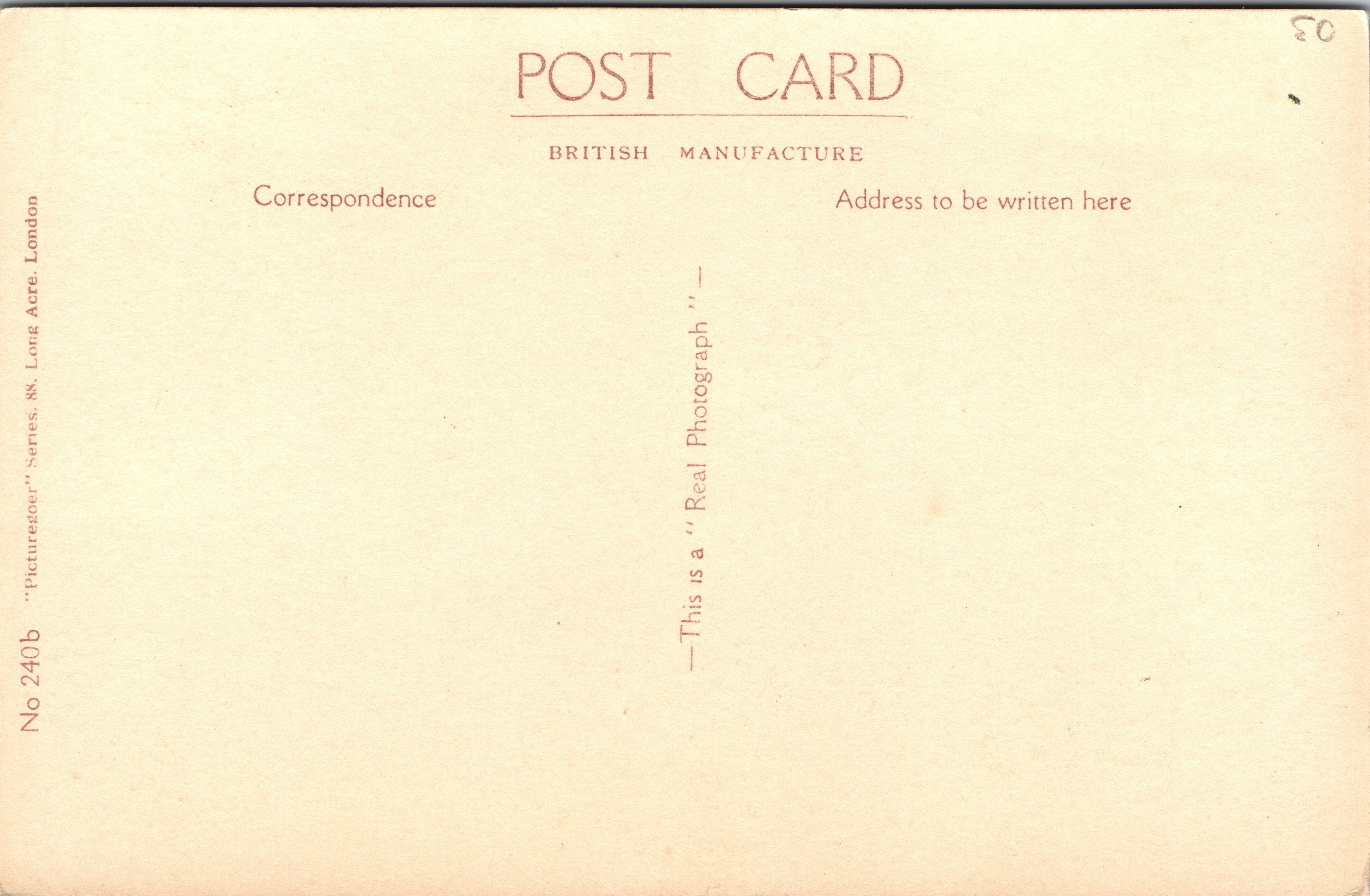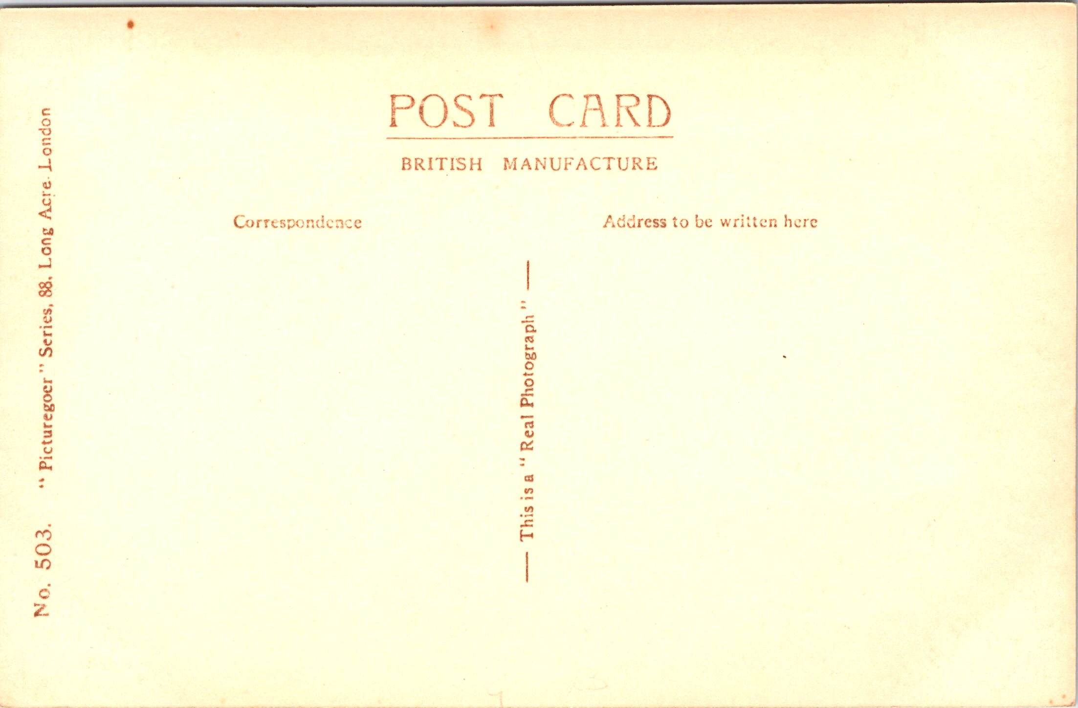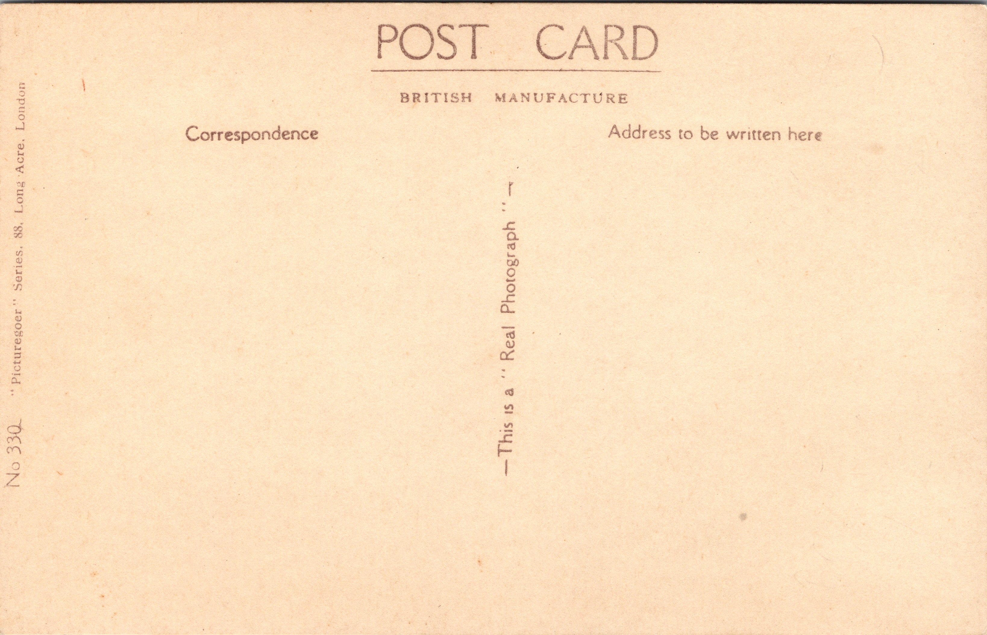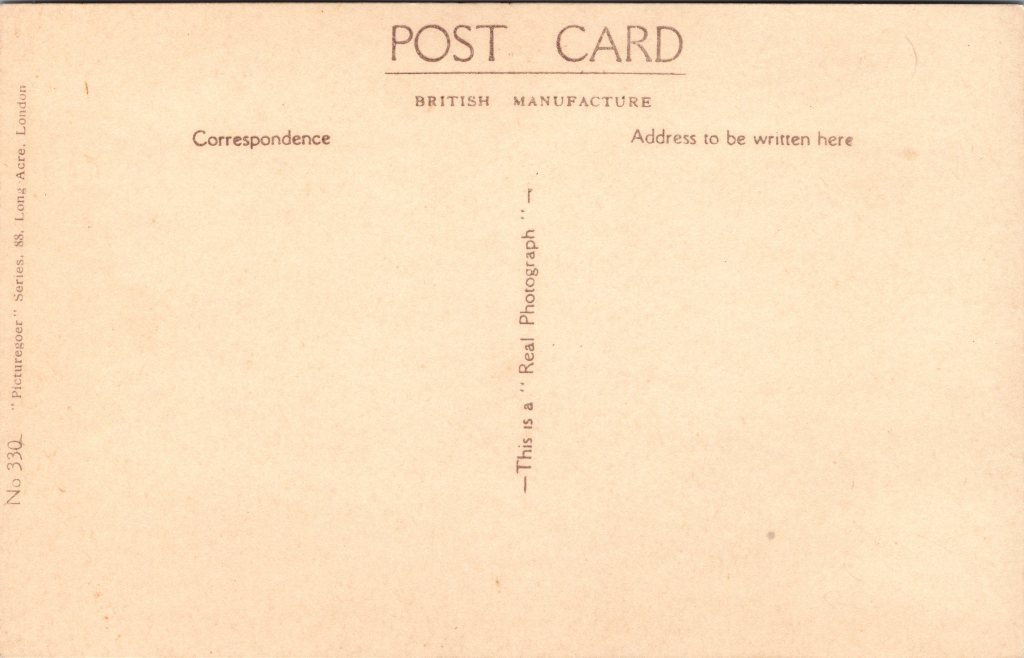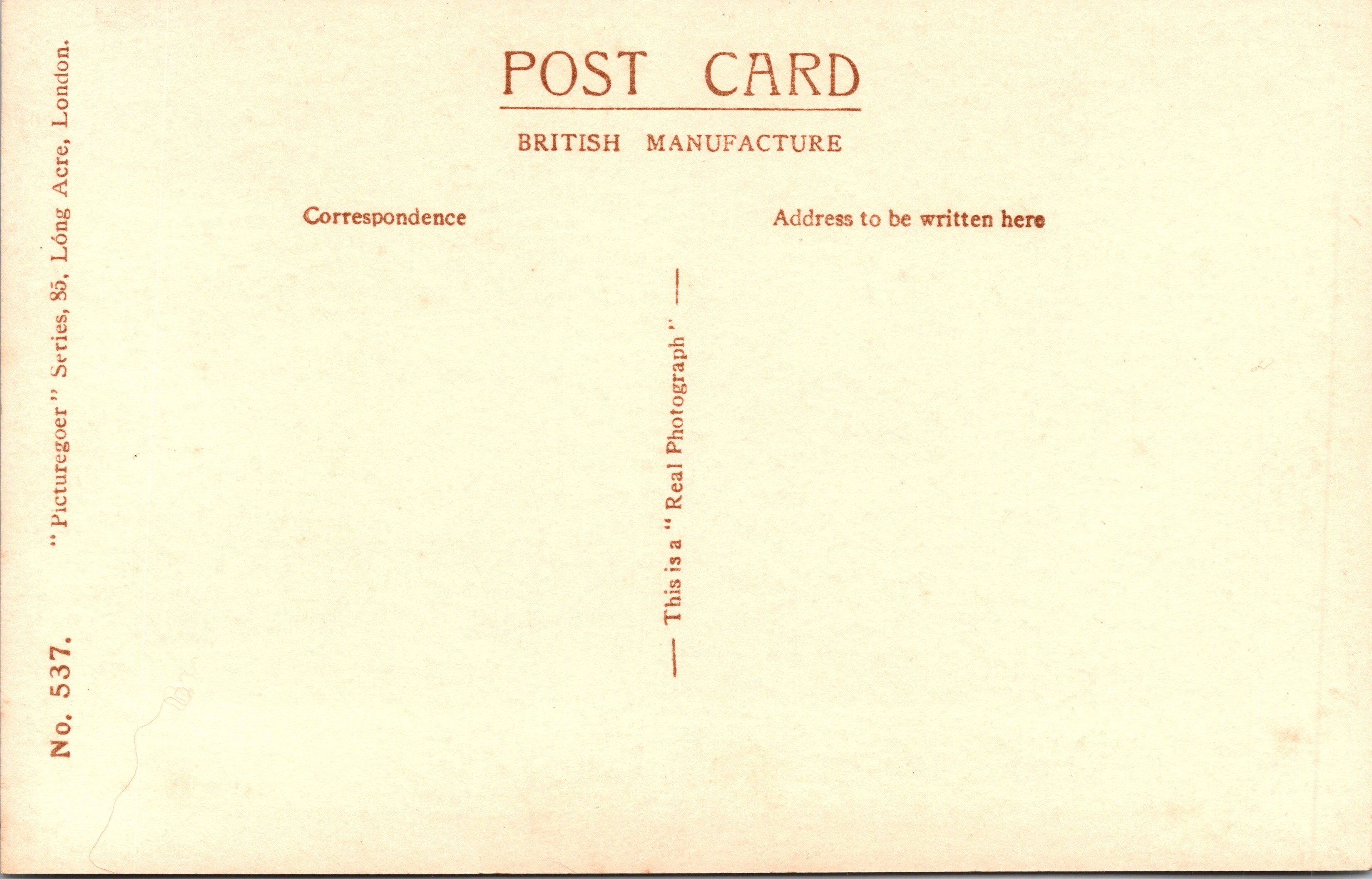 Have you ever heard of Betty Balfour? You would definitely know who she was if you lived in England during the silent film era because she is considered the most popular actress there during the 1920’s. She was known as the “British Mary Pickford” and “Britain’s Queen of Happiness”. Her fans knew her best for her “Squibs” series of films. Betty Balfour (1903-1977) was also known for her stage career. She made her stage debut in 1913 and worked in theater for several years before entering the film industry. She did not attempt to extend her career to Hollywood but she did star in a number of German films. In Britain she starred in Alfred Hitchcock’s “Champagne” (1928). Her sound era debut was in “The Nipper” (1930), Her popularity began to drop in the 1930’s though she still was getting film roles. In all, she appeared in more than 35 films. Balfour was married to composer Jimmy Campbell but the marriage fell apart in 1941 after a ten year run. She attempted a theater comeback in 1952 but it failed. She died in Weybridge, Surrey, England at the age of seventy-four. This vintage real photo postcard was produced by Picturegoer as part of a series (no. 2a). The company was based in London. Picturegoer was a British fan magazine focussing on contemporary films and the actors and actresses who performed in them. Picturegoer also published postcards. In fact, they produced over 6500 different real photo postcards on 2000 actors and actresses.