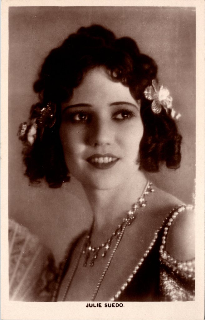 This vintage real photo postcard features English film actress, Julie Suedo (1902-1978). She played a number of glamorous roles in the 1920’s and 1930’s. She usually occupied a supporting role, rather than a starring one. The IMDb credits Suedo with 43 film appearance between 1923 and 1945. This postcard was published as part of the Picturegoer Series 88 (no.330). This photo postcard is not a common photo of Miss Suedo. (SOLD)