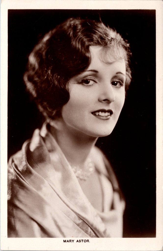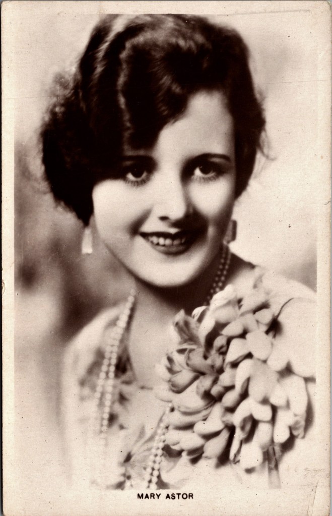 This vintage real photo postcard features American film, stage, and television actress and musician, Mary Astor (1906-1987). She played many memorable roles but she is most associated with her performance in “The Maltese Falcon” (1941). Astor also wrote five novels and an autobiography. She began her film career as a teenager by appearing in silent movies during the early 1920’s. Her career continued with the introduction of “talkies”. In 1936, Astor’s career was almost ruined by a scandal in which she had an affair with playwright George Kaufman. A custody fight with her ex-husband stigmatized her as being an adulterous wife. She managed to overcome the poor PR and in 1941, won an Academy Award fo Best Supporting Actress in “The Great Lie”. Astor was born in Quincy, Illinois. Her father was a German teacher and her mother taught drama and elocution. Astor was home schooled by her father who also taught her the piano. In 1919, she sent her photo to a beauty contest in Motion Picture Magazine. She was chosen as a semi finalist. When she was fifteen, she and her family moved to Chicago where she took drama lessons and performed on the stage. She and her family moved to New York City so she could act in motion pictures. A Manhattan photographer asked Astor to pose for him and the resulting photographs led her to be signed by Paramount pictures. In 1921, at age fourteen, she made her film debut. In 1923, she and her family moved to Hollywood. During the filming of one movie, the underage actress was wooed off set by the significantly older actor, John Barrymore. She became a “WAMPAS Baby Star” in 1926. In Hollywood, her controlling parents kept her a virtual prisoner and lived lavishly off her earnings. They gave her a five dollar a week allowance while she was earning 2500 dollars a week. Her father was emotionally and physically abusive. She did not gain control of her salary until she was 26 years old. However, this resulted in her parents suing her for financial support. In 1928 she married film director Kenneth Hawkes. In 1928, he was killed in a plane crash while filming sequences for a movie. After Astor appeared in a few more movies, she suffered a nervous breakdown related to the loss of her husband. She married the doctor who treated her for her psychiatric illness. By 1933, she had a child, and was seeking a divorce. Her personal life was coming apart at the seams. That is when the aforementioned scandal occurred. She continued to appear in films during the 1930’s but had entered the early stages of alcoholism. By 1949, she entered a sanitarium for alcoholics. In 1951, she experienced her third suicide attempt. Astor’s filmography credits her with 155 film appearances between 1921 and 1964. The IMDb reports that she appeared in two Broadway plays between 1945 and 1954. Astor was a very successful performer but was plagued by problems in her personal life.