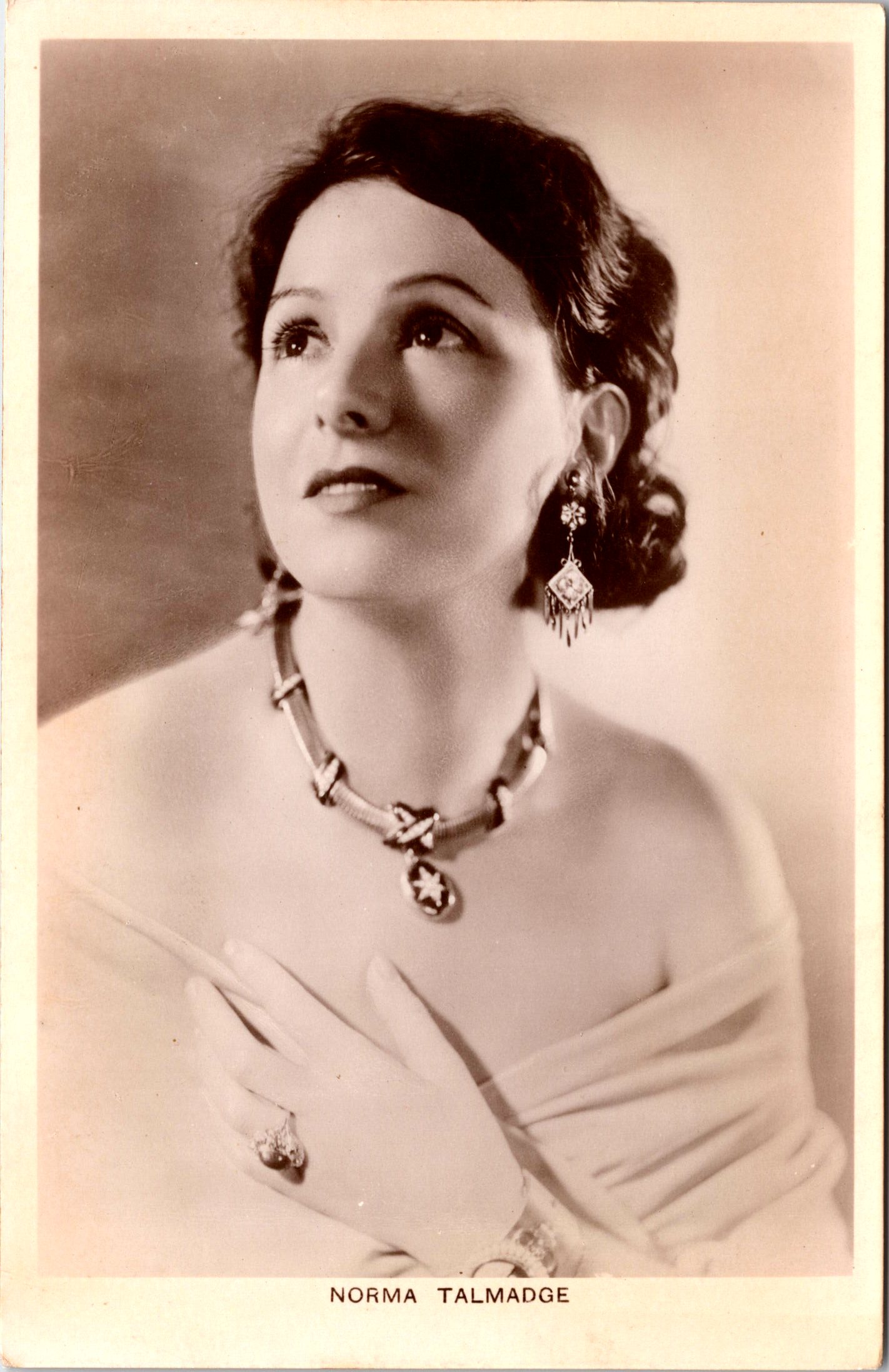 This vintage real photo postcard features American silent film actress, Norma Talmadge (1894-1957). She was noted for her dramatic and emotionally intense performances. She was one of the most popular and highly paid actresses of her era. She starred in over 200 films during her career. Raised in a show business family, Norma and her sisters Constance and Natalie Talmadge all became successful actresses. Norma began her acting career on the stage, performing in vaudeville and musical comedies. Initially, Talmadge worked for Vitagraph Studios before signing with D.W. Griffith’s Triangle Film Corporation, where she gained recognition for her talent. In the 1910s and 1920s, Talmadge became a major star, known for her ability to portray a wide range of characters. She excelled in dramatic roles, often playing heroines with complex emotions. Some of her notable films include “The Probation Wife” (1919), Smilin Through (1922), Camille (1926), and “New York Nights” (1929). Norma Talmadge was one of the few silent film stars who successfully made the transition to talkies. However, as the era of sound films emerged, her popularity waned. After her last film in 1930, Talmadge retired from acting and focused on her personal life. She married the film producer Joseph M. Schenck in 1916, and together they founded the Norma Talmadge Film Corporation. The company produced several successful films, contributing to Talmadge’s financial success and status as one of the highest-paid actresses of her time. However, her marriage to Schenck eventually ended in divorce in 1934. After her retirement from acting, Talmadge lived a private life, seldom making public appearances. She remarried in 1946 to Carvel James, a wealthy oil broker, and they remained together until her death. This vintage postcard is part of the “Picturegoer” series (No. 145B). SOLD