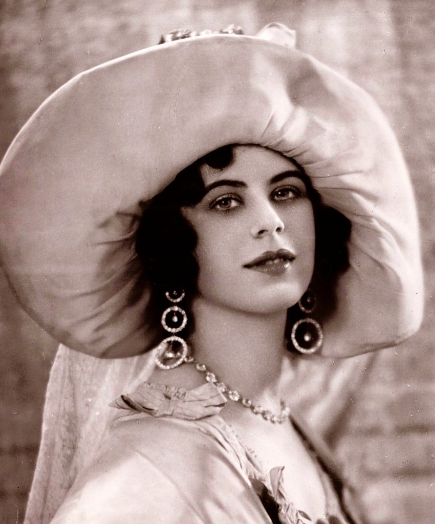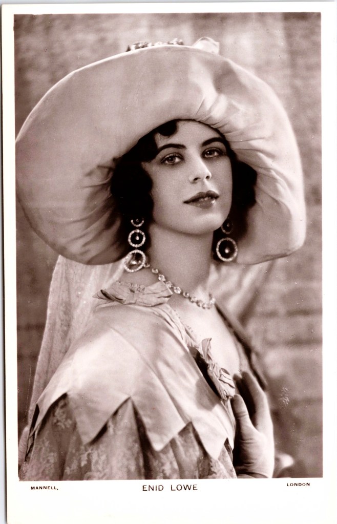 The photo postcard features Enid Lowe (1908-1994) in an elegant and theatrical pose. She was a British actress known for her work in television and theater, with notable appearances in productions such as “BBC Sunday-Night Theatre” (1950), “Educated Evans” (1957), and “Loot” (1970). In 1941, she performed in the musical “London Rhapsody” at The London Palladium. This postcard is a testament to Enid Lowe’s beauty. She is dressed in period-style attire. Her outfit includes a lavish gown with a soft, flowing texture, possibly made of silk or satin, adorned with delicate lace and ribbon details. The bodice has a gentle scalloped trim, and she wears long gloves, adding to the refinement of her look. Her accessories are striking—she wears an elaborate wide-brimmed hat with a voluminous, gathered crown, likely made of soft fabric. Her jewelry is ornate, consisting of large, dangling earrings with multiple tiers and a matching necklace of pearl-like beads. These accessories enhance the regal and theatrical nature of the portrait. Enid Lowe’s facial expression is poised and slightly enigmatic. Her dark, wavy hair is styled in an elegant, vintage fashion, framing her face beautifully. Her eyes, accentuated with dark makeup, have a confident and alluring gaze, and her lips are slightly parted, conveying a subtle yet engaging expression. The soft lighting highlights her delicate features, giving her a luminous and almost ethereal appearance. The photographer of this image, George Mannell, was based in London and was active in the early 20th century. He specialized in theatrical and celebrity portrait photography, producing high-quality postcards featuring actors and actresses of the time. His work captured the glamour and artistry of stage performers, often presenting them in elaborate costumes and dramatic poses to appeal to both fans and collectors. His work often appeared in publications such as the Picturegoer series, a popular British postcard collection featuring film stars and entertainers. SOLD