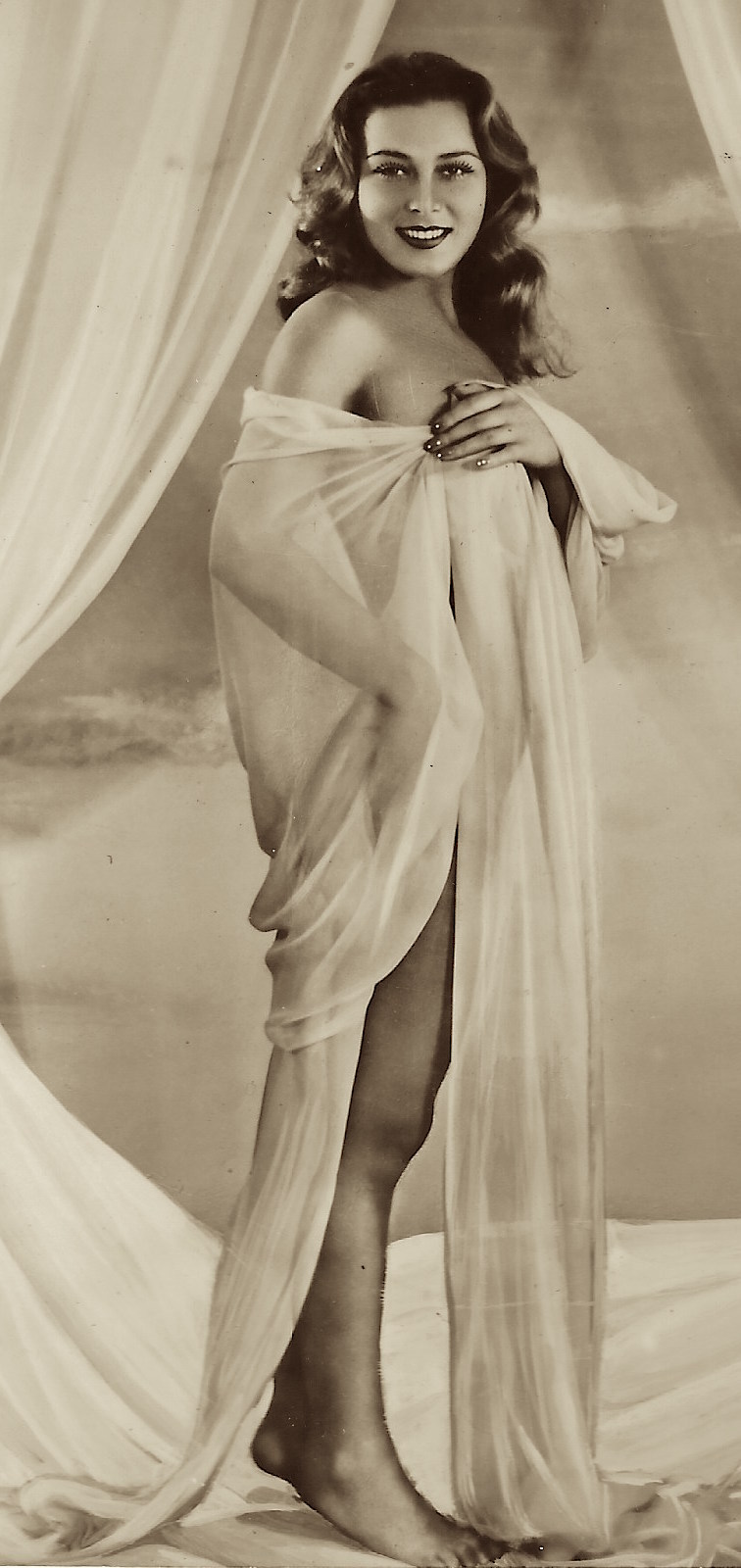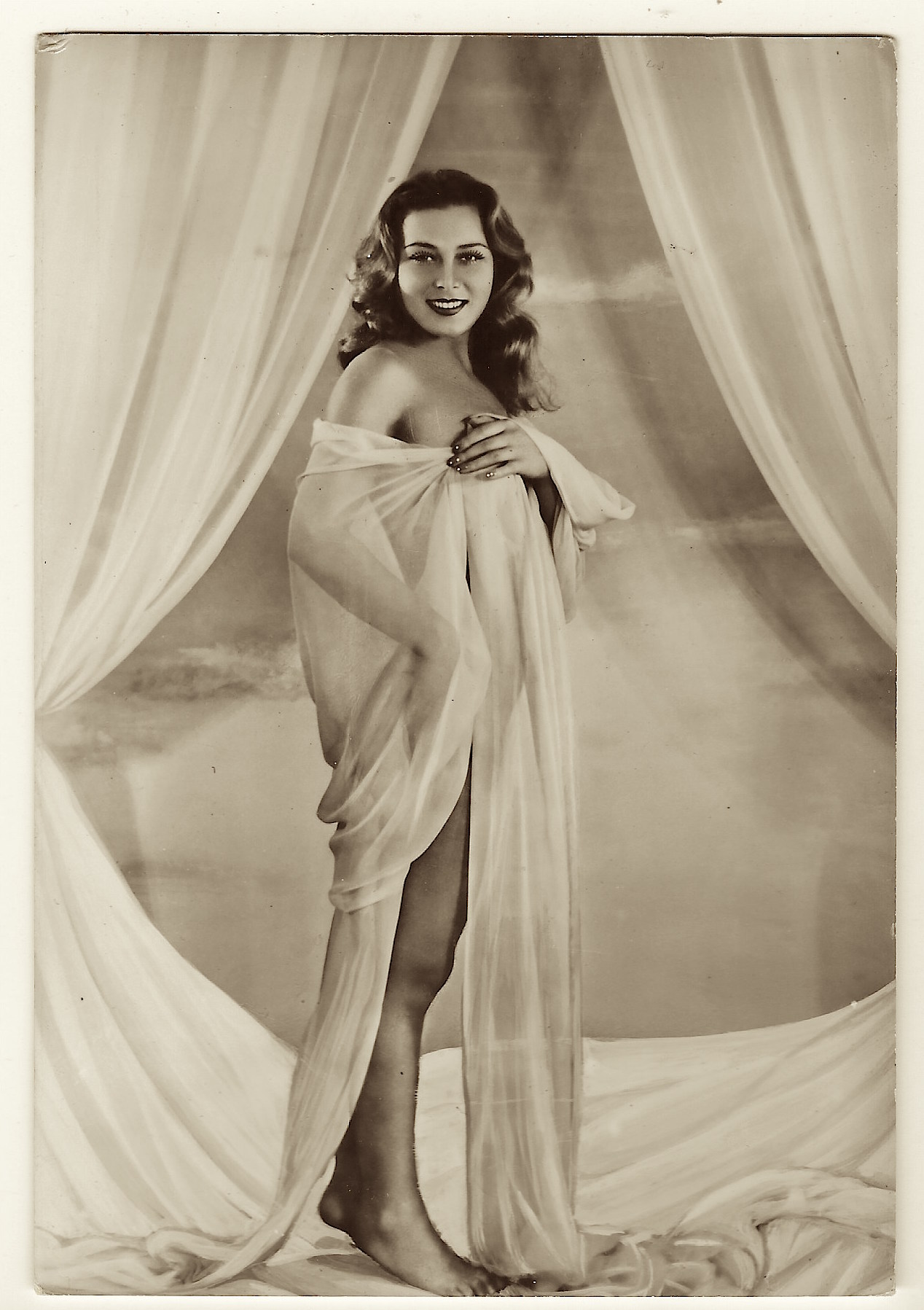This is a stunning and rare sepia-tone glamour portrait of a woman identified as Mme Le Gai, described on the reverse as a “Pantomimist” and “Vaudevillian.” Believed to date from around 1918, this photograph showcases an elegant, mysterious woman in elaborate costume—perhaps a stage or cabaret performer—gazing confidently into the camera. She wears a richly adorned hat with plumes, a beaded glove-like bracelet, and a delicately embroidered gown with satin and lace textures. Her theatrical pose and sensual expression make this image a prime example of early Hollywood pin-up photography, though its style is also heavily influenced by European cabaret traditions. The handwritten inscription on the back appears to read: “Mme Le Gai / Pantomimist / Vaudevillian.” There is some ambiguity—“Mme” could stand for Madame or Mademoiselle, and the surname may also be interpreted as Le Gai or Le Gaï. The elegant script suggests a deliberate stage name, possibly borrowed from the famed Parisian pantomime houses of the same name. “Le Gai” (French for “the merry” or “joyful”) was also used in naming French performance venues such as Le Théâtre Gai or variations like Le Gai Paris. This connection strengthens the possibility that the subject either performed in or took inspiration from these Parisian theatrical traditions. Though solid biographical confirmation of Mme Le Gai has not yet been found, the visual evidence, style, and inscription point to her role as a vaudeville-era pantomime performer, likely active in the United States or France around World War I. Her alluring presence and costume are consistent with the kind of studio portraiture used for performer promotion, possibly circulated as publicity or collectible pin-up material during the silent film and vaudeville boom. (SOLD)