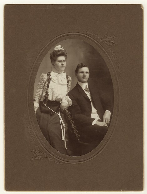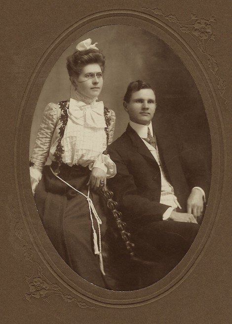 This vintage photograph features an attractive and well dressed young couple. Perhaps this photo is a wedding picture. The couple are wearing formal clothing and the woman is flashing a ring on the ring finger of her left hand. The gentleman is wearing a wide collar as well as cuff links. The woman has what appears to be a tied loose cord hanging loosely from her waist. I wonder what the purpose is of the cord. Is it just for fashion sake? The woman is also wearing a pince nez, a style of glasses popular in the late 19th and early 20th centuries. The glasses stay on the wearers face by pinching the bridge of their nose. The glasses have no earpieces. An inscription, lightly written in pencil on the reverse of the photograph provides us with some information about the photograph. The photo was taken in 1903 or 1904. The studio was located in West Point, Mississippi. It is situated in the Northeast section of the state. In 1909, President William Taft visited West Point, Mississippi and made some remarks as he stood on the platform of the last train car. SOLD