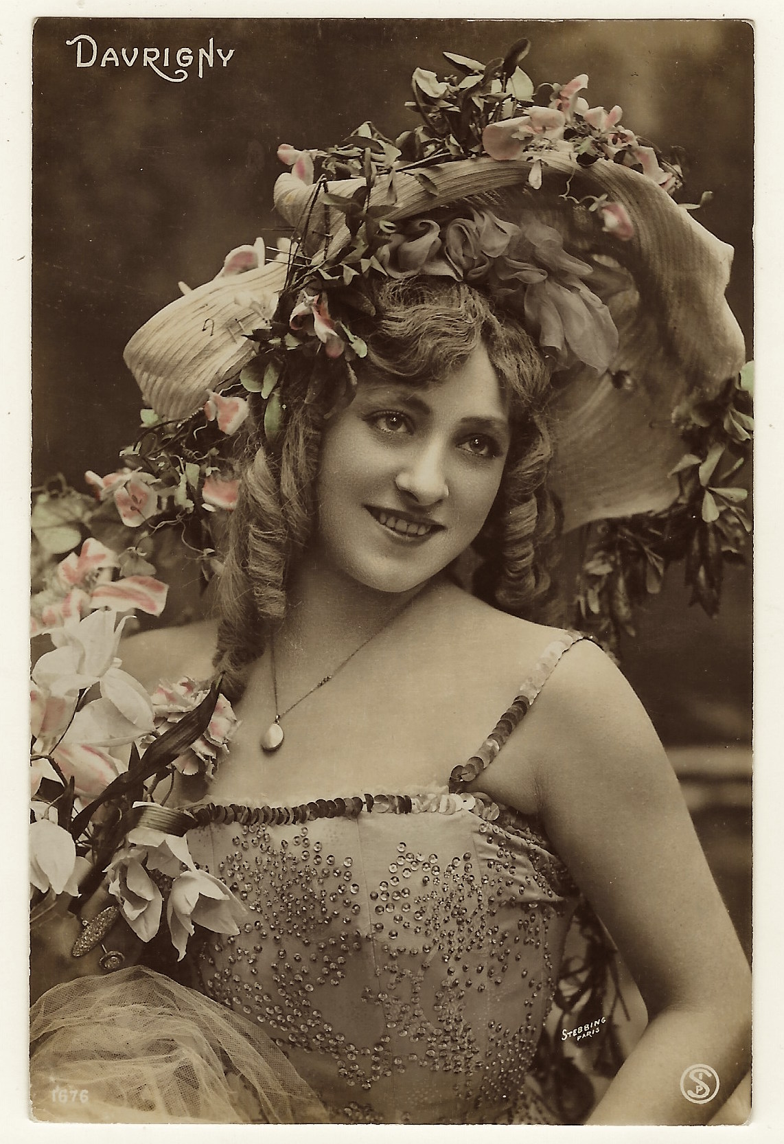 These color tinted vintage real photo postcards feature French actress and singer, Jane Hading (1859-1941). She was born in Marseille, France and was the illegitimate daughter of an actor there at the Theatre du Gymnase. She made her first stage appearance at three years of age. She trained at the local Conservatoire and in 1873 she was hired to perform at a theatre in Algiers. She then was engaged to perform in Cairo, Egypt, where she played coquette, soubrette and ingenue roles. Returning to Marseille, she did stage acting and she sang in operettas. Her first appearance in Paris was in 1879 at the Palais Royal. In 1884, she married playwright and theatre manager, Victor Koning but the pair were divorced within three years. In 1888 and 1893, she toured America. Later, she toured South America with a theater company. In around 1892 she joined the Comedie Francaise. By this time, she was an established star in France, America, and England. She was also considered one of the prettiest actresses of her time.