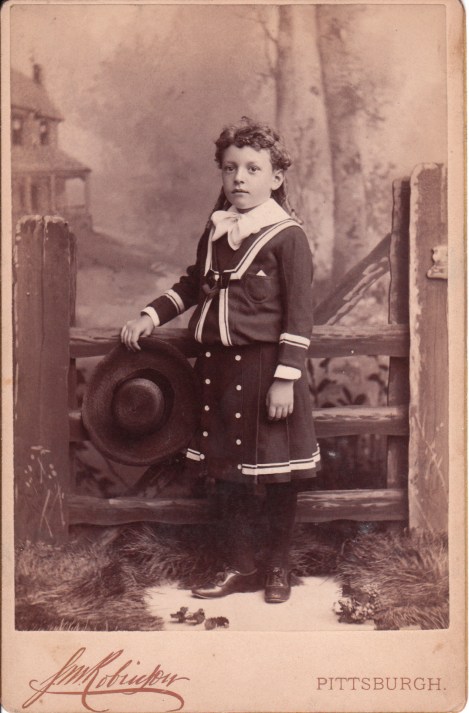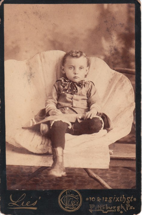 This cabinet card is a portrait of a little boy sitting quite comfortably in a sea shell chair. He appears disinterested in his surroundings at the Lies’s Studio in Pittsburgh, Pennsylvania. He looks cute in his polka dot bow tie and fancy clothing. The seashell chair prop in this photograph is very unusual; in fact, such a chair has not come to the attention of the Cabinet Card Gallery ever before. The photographer, George Lies, deserves credit for his creativity.