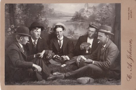The “bad boys” are in town and they are gathered to play a mean game of cards and enjoy their smokes. Traveling photographer, C. A. Johnson has posed the five men in front of a painted river scene. The guys seem quite natural in this gambling milieu. My guess is, that “they’ve been there, and done that”. Its a bit unusual to see cigarettes in cabinet card photography, but they fit this scene perfectly.