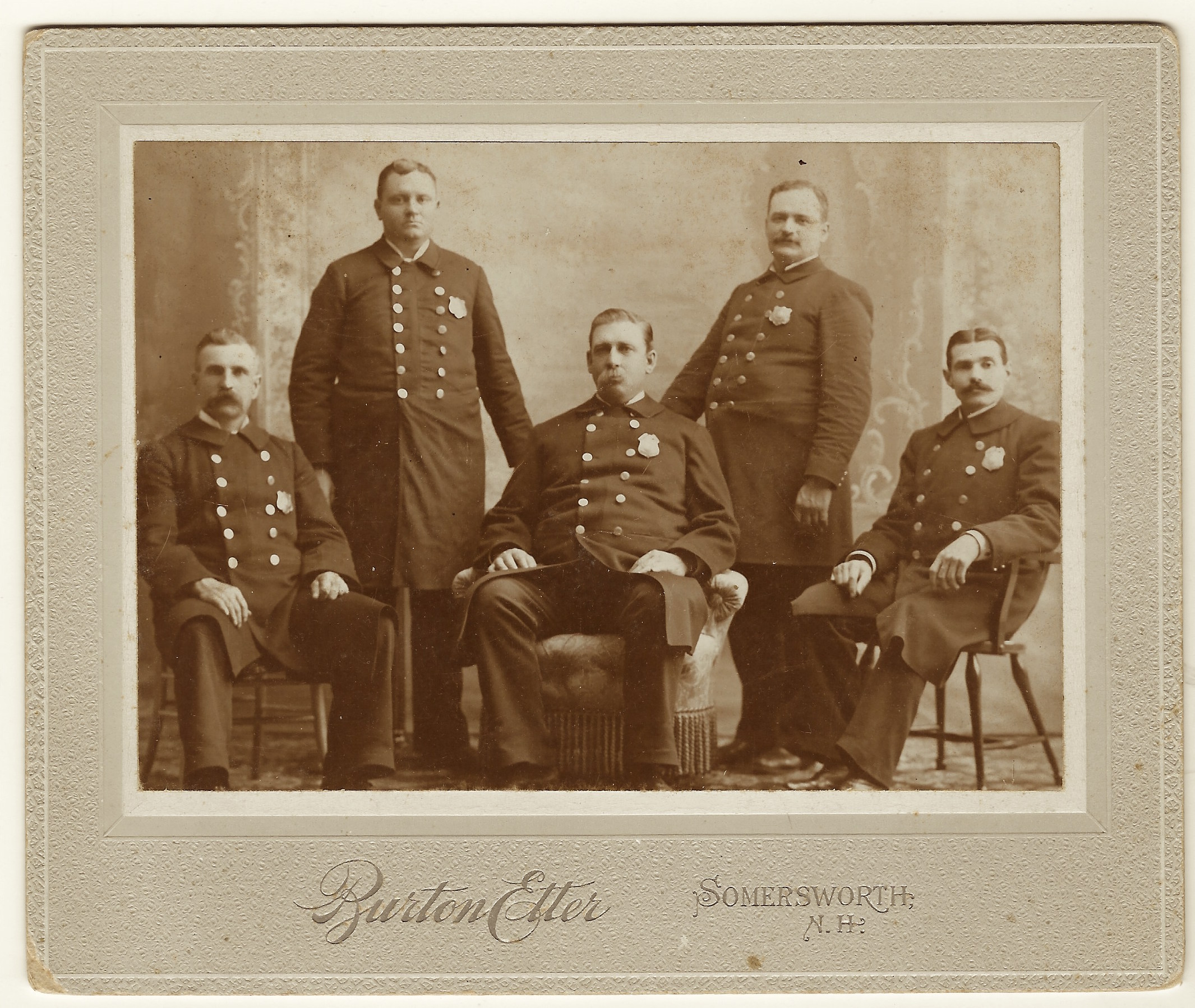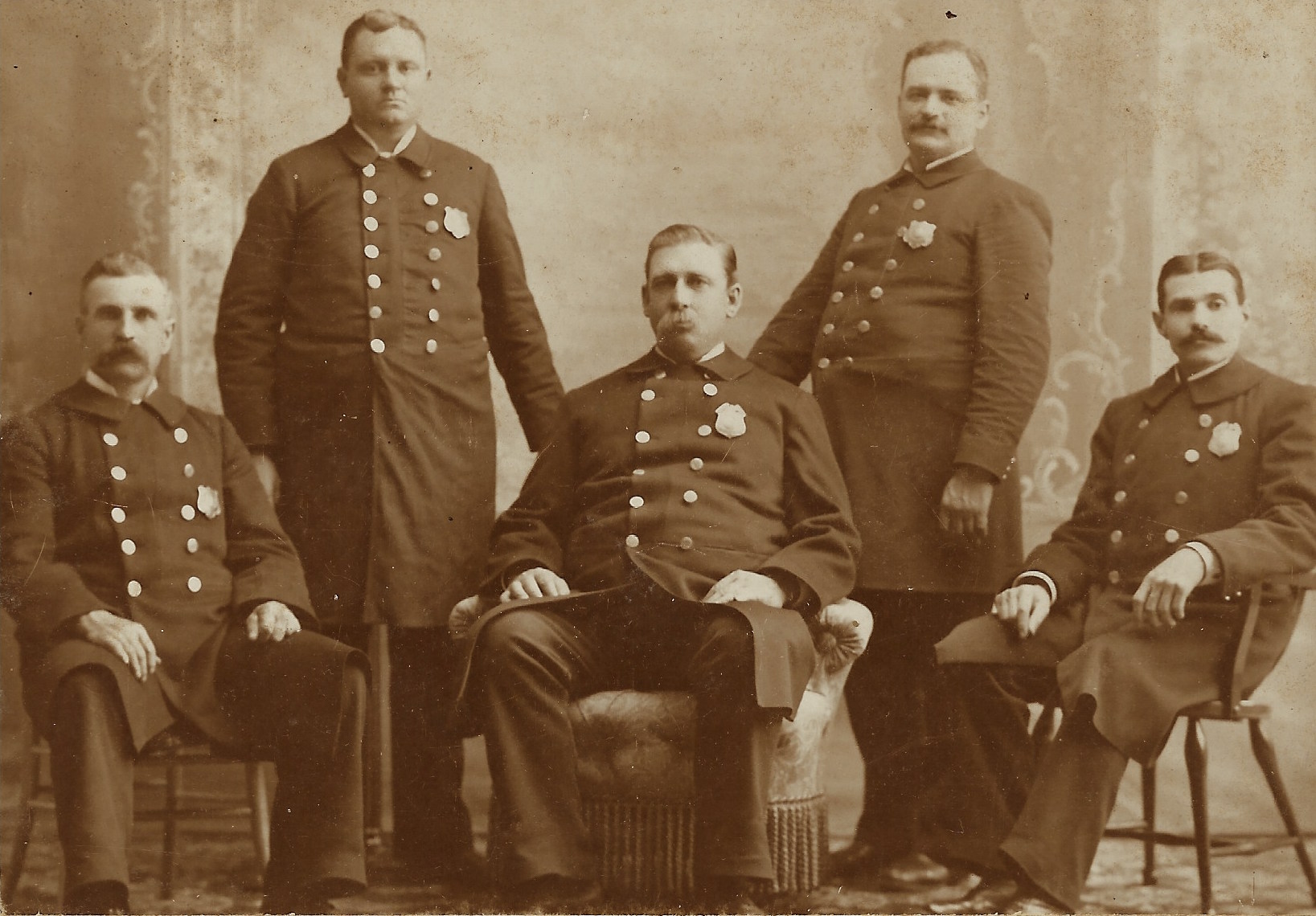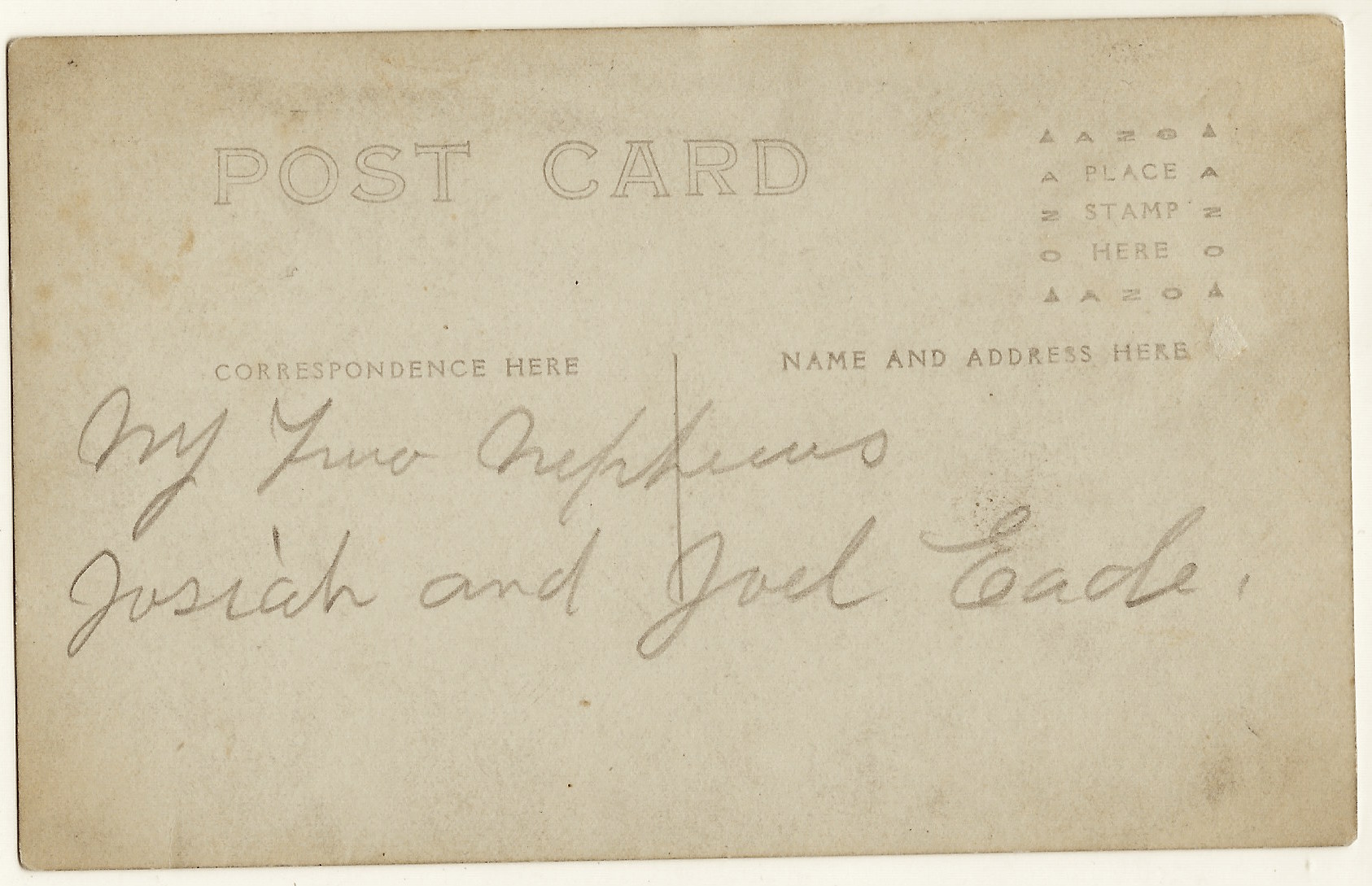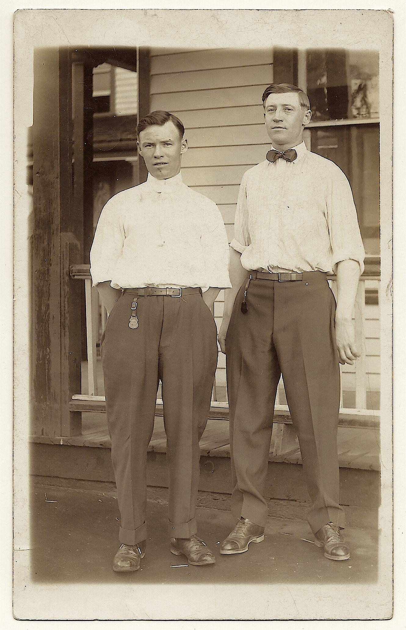 This vintage real photo postcard features two lawmen posing in front of a house or office building. Both men are wearing badges which likely indicates they represent some form of law enforcement. An inscription on the reverse of the card identifies the men as Josiah and Joel “Cade”. I am unsure that I deciphered their last name correctly. The men are nephews of the inscriber. Not quite the Earp brothers, but this is a nice portrait of two brothers serving as serving in small town law enforcement. The AZO stamp box on the reverse of this postcard, indicates that the card was produced sometime between 1904 and 1918. The postcard is in good condition (see scans).