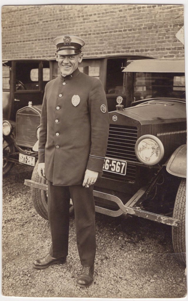 This vintage photograph features a smiling uniformed policeman posing in front of a row of police cars. An inscription on the reverse of the photo reveals that the policeman is on the Los Angeles Police Force and this photograph was taken in 1924 when no one ever heard of SWAT or Tasers. SOLD