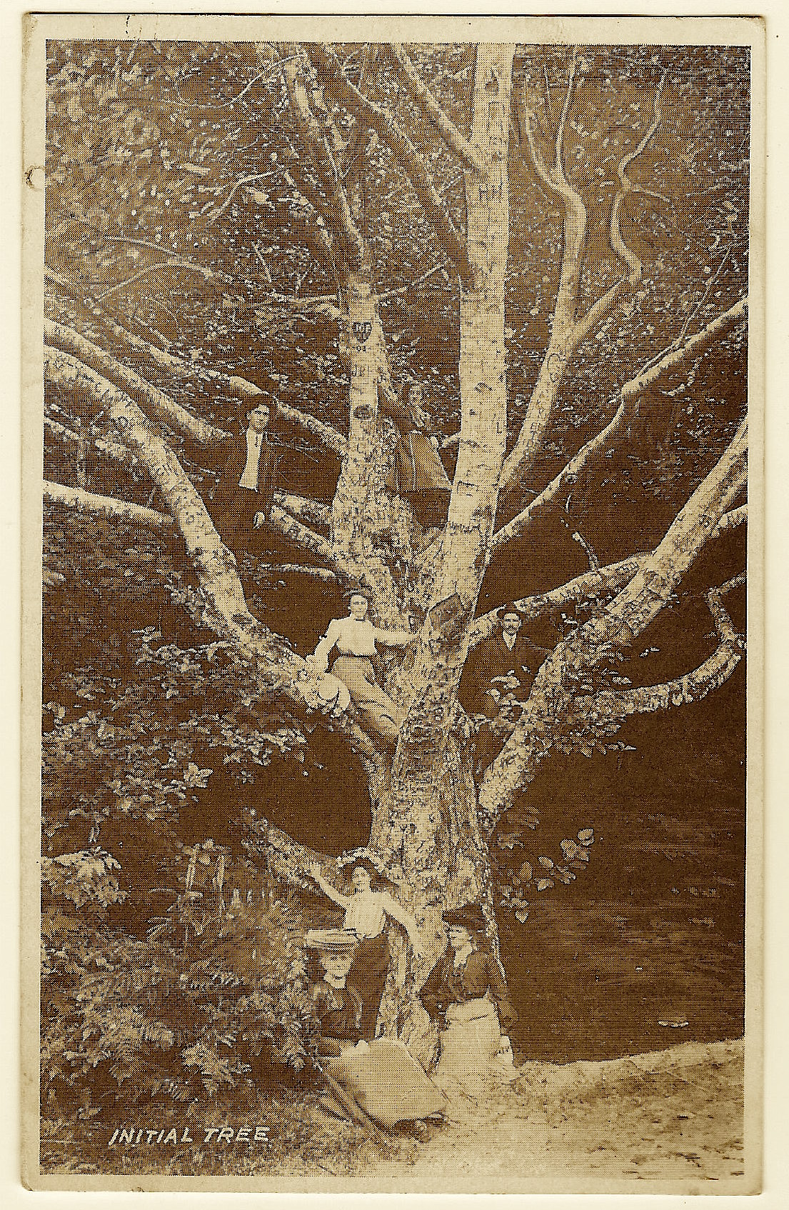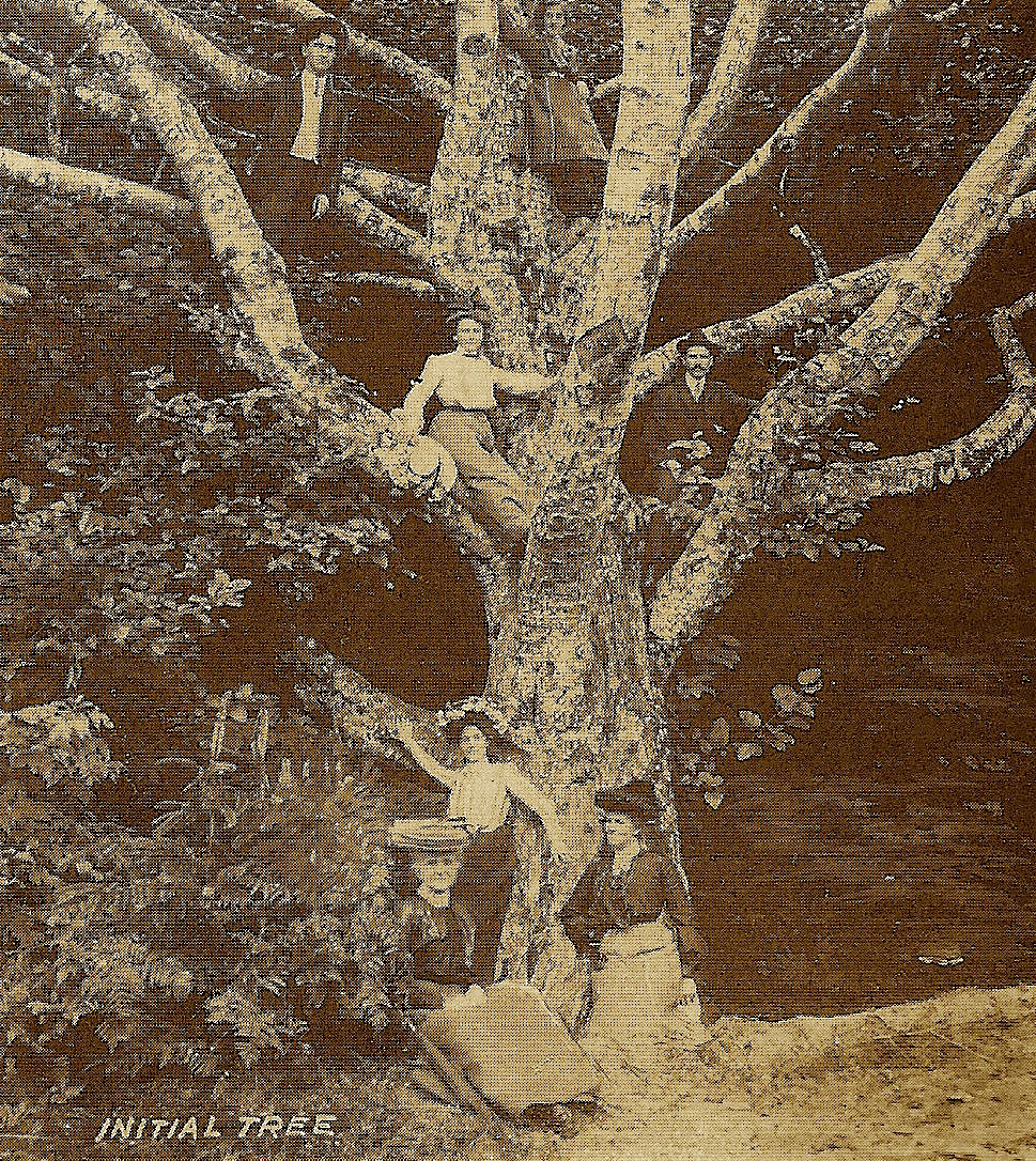 This vintage real photo postcard features a family visiting the “Initial Tree”. This family is not content to have a passive sight-seeing visit to the tree. Instead, this experiential family preferred to climb the tree and have their portrait taken. Three members of the family stand at the base of the tree while four others are perched on limbs or branches looking very much like human ornaments. The message on the postcard and the date on the postmark both disclose that the card was written and mailed in 1910. The postcard is from Aunt Dora to her niece, Tilly, in Portland, Oregon. The postmark discloses that the card was mailed from Nahcotta, Washington. The town is located on Willapa Bay, on the eastern coast of the Long Beach Peninsula. Nahcotta was settled in 1890 and named after an Indian chief. This real photo portrait postcard is in very good condition (see scans). SOLD
